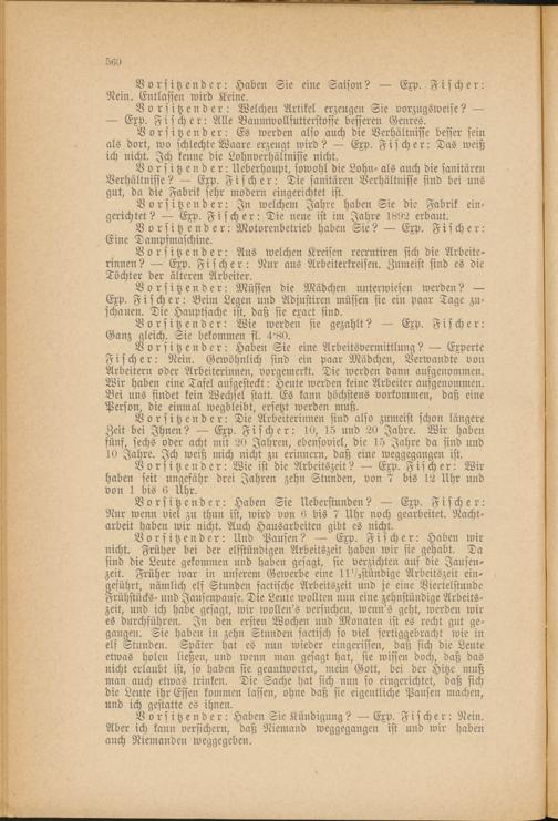 Vorsitzender: Haben Sie Ueberstunden? Exp. Fischer: Nur wenn viel zu thun ist, wird von 6 bis 7 Uhr noch gearbeitet. Nacht­arbeit haben wir nicht. Auch Hausarbeiten gibt es nicht.
