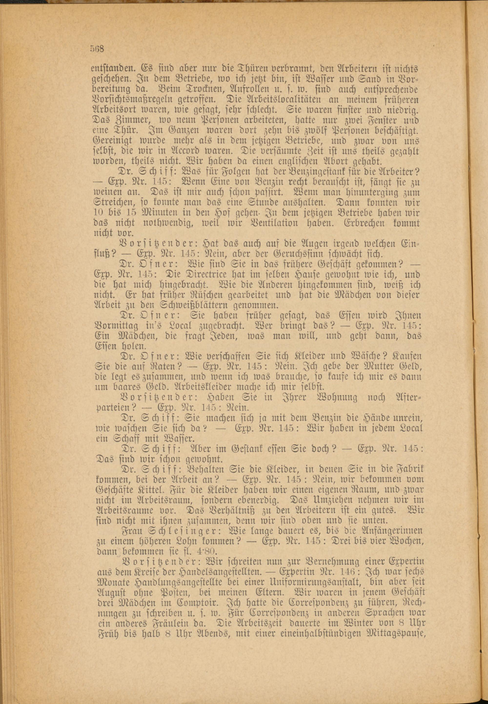 Dr. Schiff: Was für Folgen hat der Benzingestank für die Arbeiter? Exp. Nr. 145: Wenn Eine von Benzin recht berauscht ist, fängt sie zu weinen an. Das ist mir auch schon passirt. Wenn man hinunterging zum Streichen, so konnte man das eine Stunde aushalten. Dann konnten wir 10 bis 15 Minuten in den Hof gehen- In dem jetzigen Betriebe haben wir das nicht nothwendig, weil wir Ventilation haben. Erbrechen kommt nicht vor.
