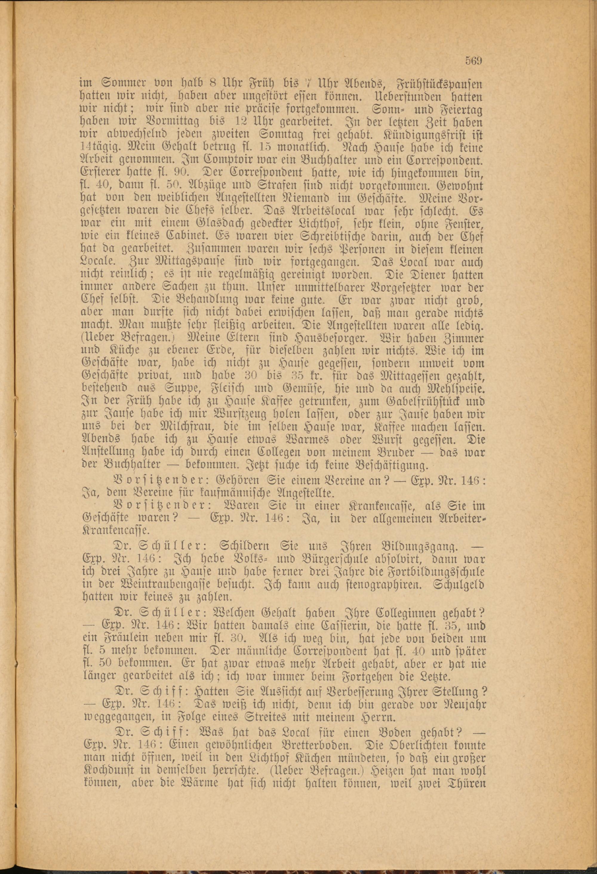 Exp. Nr. 146: Wir hatten damals eine Cassierin, die hatte fl. 35, und ein Fräulein neben mir fl. 30. Als ich weg bin, hat jede von beiden um fl. 5 mehr bekommen. Der männliche Correspondent hat fl. 40 und später fl. 50 bekommen. Er hat zwar etwas mehr Arbeit gehabt, aber er hat nie länger gearbeitet als ich; ich war immer beim Fortgehen die Letzte.