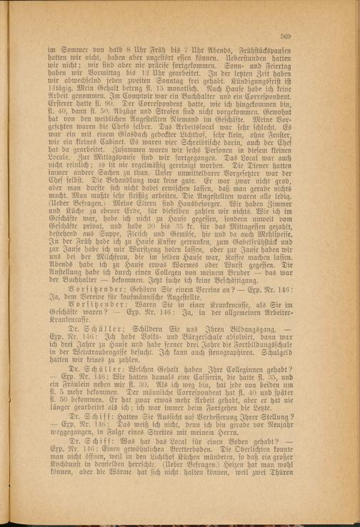 Dr. Schriller: Schildern Sie uns Ihren Bildungsgang. Exp. Nr. 146: Ich habe Volks- und Bürgerschule absolvirt, dann war ich drei Jahre zu Hause und habe ferner drei Jahre die Fortbildungsschule in der Weintraubengasse besucht. Ich kann auch stenographiren. Schulgeld hatten wir keines zu zahlen.
