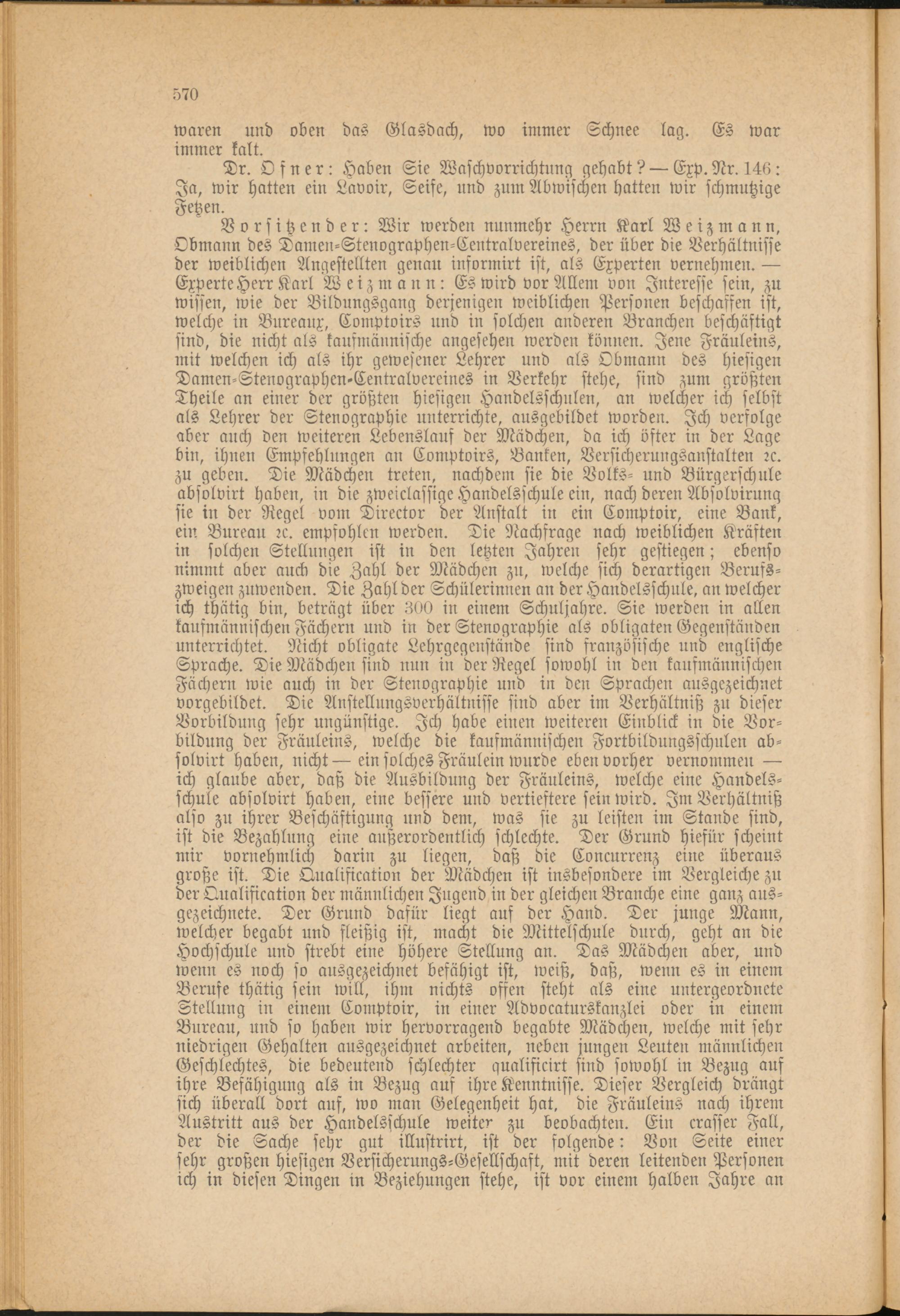 Vorsitzender: Wir werden nunmehr Herrn Karl Weizmann, Obmann des Damen-Stenographen-Centralvereines, der über die Verhältnisse der weiblichen Angestellten genau iuformirt ist, als Experten vernehmen. — Experte Herr Karl Weizmann: Es wird vor Allem von Interesse sein, zu wissen, wie der Bildungsgang derjenigen weiblichen Personen beschaffen ist, welche in Bureaux, Comptoirs und in solchen anderen Branchen beschäftigt sind, die nicht als kaufmännische angesehen werden können. Jene Fräuleins, mit welchen ich als ihr gewesener Lehrer und als Obmann des hiesigen Damen-Stenographen-Centralvereines in Verkehr stehe, sind zum größten Theile an einer der größten hiesigen Handelsschulen, an welcher ich selbst als Lehrer der Stenographie unterrichte, ausgebildet worden. Ich verfolge aber auch den weiteren Lebenslauf der Mädchen, da ich öfter in der Lage bin, ihnen Empfehlungen an Comptoirs, Banken, Versicherungsanstalten rc. zu geben. Die Mädchen treten, nachdem sie die Volks- und Bürgerschule absolvirt haben, in die zweiclassige Handelsschule ein, nach deren Absolvirunq sie in der Regel vom Director der Anstalt in ein Comptoir, eine Bank, ein Bureau rc. empfohlen werden. Die Nachfrage nach weiblichen Kräften in solchen Stellungen ist in den letzten Jahren sehr gestiegen; ebenso nimmt aber auck die Zahl der Mädchen zu, welche sich derartigen Beruss- zweigen zuwenden. Die Zahl der Schülerinnen an der Handelsschule, an welcher ich thätig bin, beträgt über 300 in einem Schuljahre. Sie werden in allen kaufmännischen Fächern und in der Stenographie als obligaten Gegenständen unterrichtet. Nicht obligate Lehrgegenstände sind französische und englische Sprache. Die Mädchen sind nun in der Regel sowohl in den kaufmännischen Fächern wie auch in der Stenographie und in den Sprachen ausgezeichnet vorgebildet. Die Anstellungsverhältnisse sind aber im Verhältniß zu dieser Vorbildung sehr ungünstige. Ich habe einen weiteren Einblick in die Vorbildung der Fräuleins, welche die kaufmännischen Fortbildungsschulen absolvirt haben, nicht—ein solches Fräulein wurde eben vorher vernommen — ich glaube aber, daß die Ausbildung der Fräuleins, welche eine Handelsschule absolvirt haben, eine bessere und vertiestere sein wird. Im Verhältniß also zu ihrer Beschäftigung und dem, was sie zu leisten im Stande sind, ist die Bezahlung eine außerordentlich schlechte. Der Grund hiefür scheint mir vornehmlich darin zu liegen, daß die Concurrenz eine überaus große ist. Die Qualifikation der Mädchen ist insbesondere im Vergleiche zu der Qualifikation der männlichen Jugend in der gleichen Branche eine ganz ausgezeichnete. Der Grund dafür liegt auf der Hand. Der junge Mann, welcher begabt und fleißig ist, macht die Mittelschule durch, geht an die Hochschule und strebt eine höhere Stellung an. Das Mädchen aber, und wenn es noch so ausgezeichnet befähigt ist, weiß, daß, wenn es in einem Berufe thätig sein will, ihm nichts offen steht als eine untergeordnete Stellung in einem Comptoir, in einer Advocaturskanzlei oder m einem Bureau, und so haben wir hervorragend begabte Mädchen, welche mit sehr niedrigen Gehalten ausgezeichnet arbeiten, neben jungen Leuten männlichen Geschlechtes, die bedeutend schlechter qualificirt sind sowohl in Bezug auf ihre Befähigung als in Bezug auf ihre Kenntnisse. Dieser Vergleich drängt sich überall dort auf, wo man Gelegenheit hat. die Fräuleins nach ihrem Austritt aus der Handelsschule weiter zu beobachten. Ein krasser Fall, der die Sache sehr gut illustrirt, ist der folgende: Von Seite einer sehr großen hiesigen Versicherungs-Gesellschaft, mit deren leitenden Personen ich in diesen Dingen in Beziehungen stehe, ist vor einem halben Jahre an