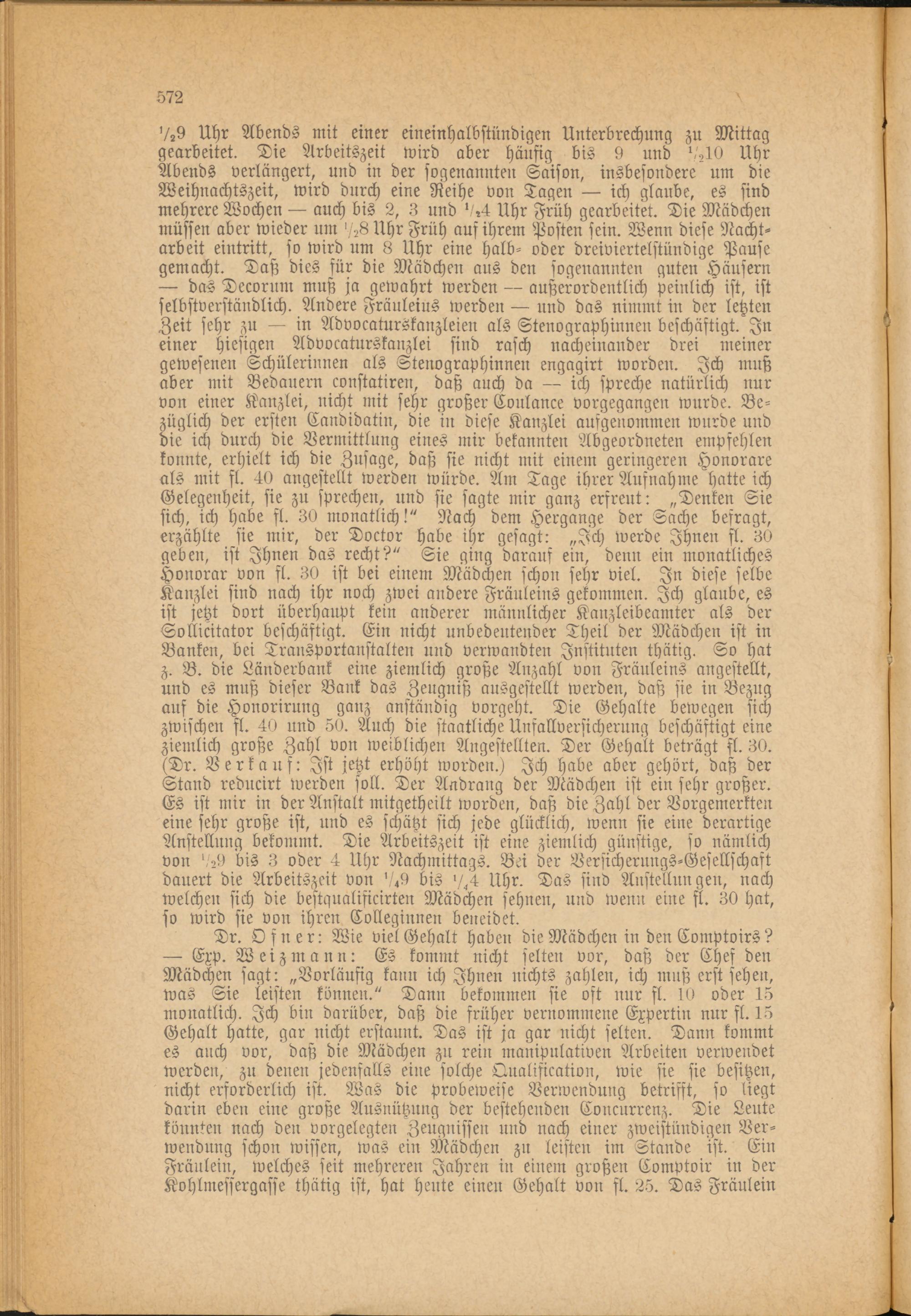 — das Decorum muß ja gewahrt werden — außerordentlich peinlich ist, ist selbstverständlich. Andere Fränleius werden — und das nimmt in der letzten Zeit sehr zu — in Advocaturskanzleien als Stenographinnen beschäftigt. In einer hiesigen Advocaturskanzlei sind rasch nacheinander drei meiner gewesenen Schülerinnen als Stenographinnen engagirt worden. Ich muß aber mit Bedauern constatiren, daß auch da — ich spreche natürlich nur von einer Kanzlei, nicht mit sehr großer Coulance vorgegangen wurde. Bezüglich der ersten Candidatin, die in diese Kanzlei aufgenommen wurde und die ich durch die Vermittlung eines mir bekannten Abgeordneten empfehlen konnte, erhielt ich die Zusage, daß sie nicht mit einem geringeren Honorare als mit fl. 40 angestellt werden würde. Am Tage ihrer Aufnahme hatte ich Gelegenheit, sie zu sprechen, und sie sagte mir ganz erfreut: „Denken Sie sich, ich habe sl. 30 monatlich!" Nach dem Hergänge der Sache befragt, erzählte sie mir, der Doctor habe ihr gesagt: „Ich werde Ihnen fl. 30 geben, ist Ihnen das recht?" Sie ging darauf ein, denn ein monatliches Honorar von sl. 30 ist bei einem Mädchen schon sehr viel. In diese selbe Kanzlei sind nach ihr noch zwei andere Fräuleins gekommen. Ich glaube, es ist jetzt dort überhaupt kein anderer männlicher Kanzleibeamter als der Sollicitator beschäftigt. Ein nicht unbedeutender Theil der Mädchen ist in Banken, bei Transpörtanstalten und verwandten Instituten thätig. So hat z. B. die Länderbank eine ziemlich große Anzahl von Fräuleins angestellt, und es muß dieser Bank das Zeugniß ausgestellt werden, daß sie in Bezug auf die Honorirnng ganz anständig vorgeht. Die Gehalte bewegen sich zwischen fl. 40 und 50. Auch die staatliche Unfallversicherung beschäftigt eine ziemlich große Zahl von weiblichen Angestellten. Der Gehalt beträgt sl. 30. (Dr. Verkauf: Ist jetzt erhöht worden.) Ich habe aber gehört, daß der Stand reducirt werden soll. Der Andrang der Mädchen ist ein sehr großer. Es ist nur in der Anstalt mitgetheilt worden, daß die Zahl der Vorgemerkten eine sehr große ist, und es schätzt sich jede glücklich, wenn sie eine derartige Anstellung bekommt. Die Arbeitszeit ist eine ziemlich günstige, so nämlich von 04) bis 3 oder 4 Uhr Nachmittags. Bei der Versichernngs-Gesellschaft dauert die Arbeitszeit von ' <9 bis 0,4 Uhr. Das sind Anstellungen, nach welchen sich die bestqualificirten Mädchen sehnen, und wenn eine fl. 30 hat, so wird sie von ihren Colleginnen beneidet.