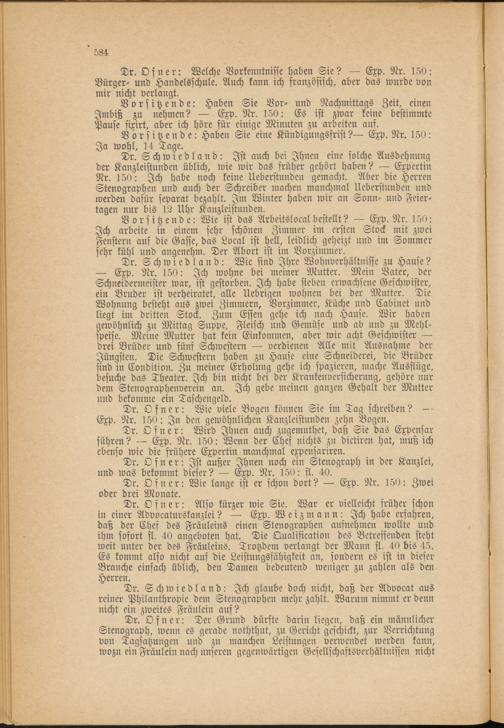 Dr. Ofner: Also kürzer wie Sie. War er vielleicht früher schon in einer Advocaturskanzlei? Exp. Weizmann: Ich habe erfahren, daß der Chef des Fräuleins einen Stenographen aufnehmen wollte und ihm sofort fl. 40 angeboten hat. Die Qualification des Betreffenden steht weit unter der des Fräuleins. Trotzdem verlangt der Mann fl. 40 bis 45. Es kommt also nicht auf die Leistungsfähigkeit an, sondern es ist in dieser Branche einfach üblich, den Damen bedeutend weniger zu zahlen als den Herren.