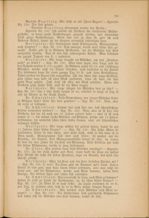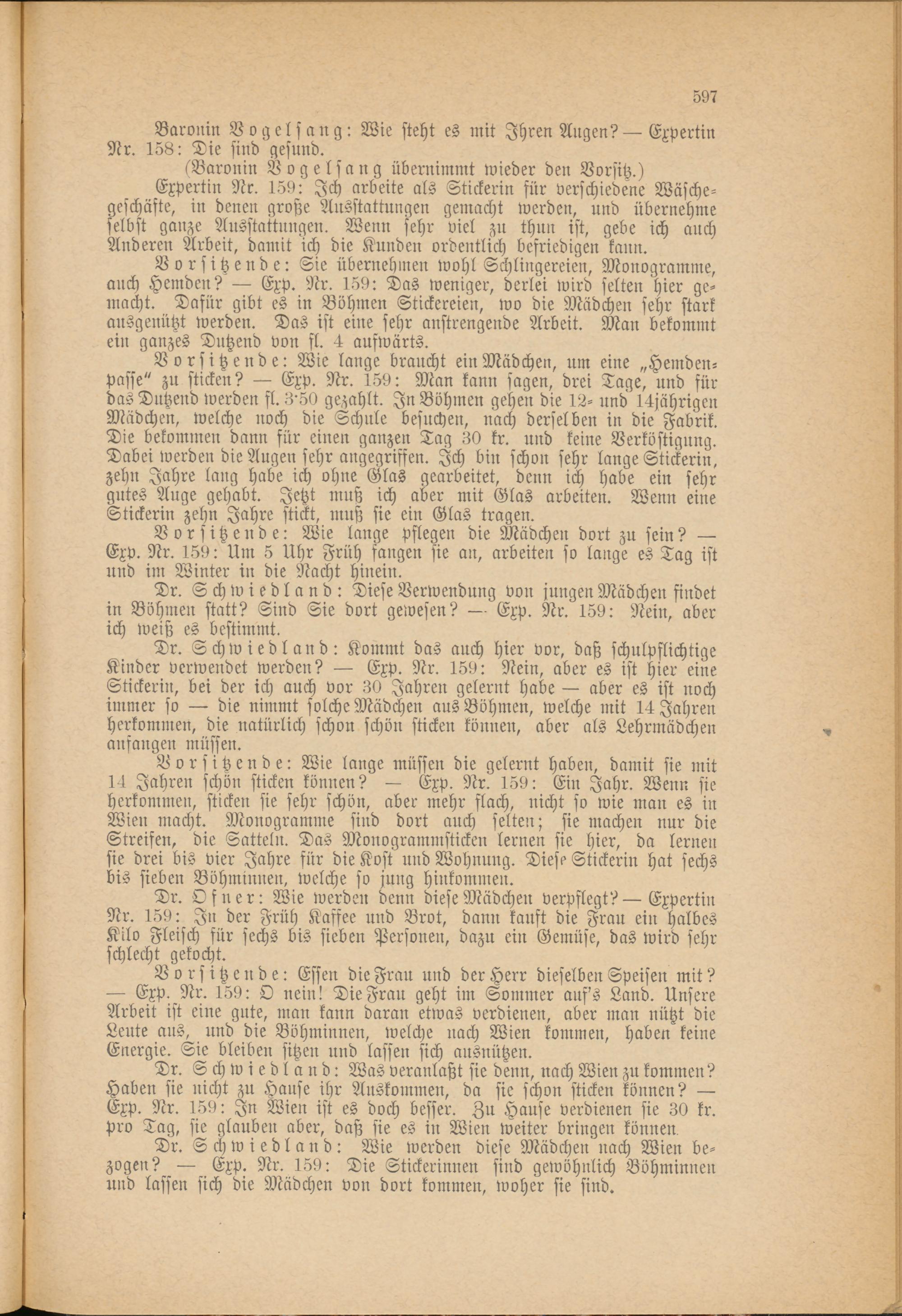 Dr. Schwiedland: Wie werden diese Mädchen nach Wien bezogen? — Exp. Nr. 159: Die Stickerinnen sind gewöhnlich Böhminuen und lassen sich die Mädchen von dort kommen, woher sie sind.
