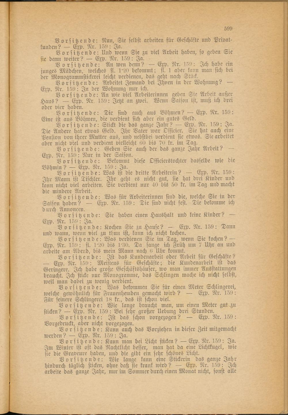 Vorsitzende: Stickt die das ganze Jahr? — Exp. Nr. 159: Ja. Die Andere hat etwas Geld. Ihr Vater war Officier. Sie hat auch eine Pension von ihrer Mutter aus, und nebstbei verdient sie etwas. Sie arbeitet aber nicht viel und verdient vielleicht 60 bis 70 kr. im Tag.