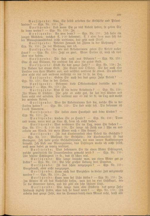 Vorsitzende: Wie lange kann eine Stickerin das ganze Jahr hindurch täglich sticken, ohne daß sie krank wird? — Exp. Nr. 159: Ich arbeite das ganze Jahr, nur im Sommer durch einen Monat nicht, sonst alle