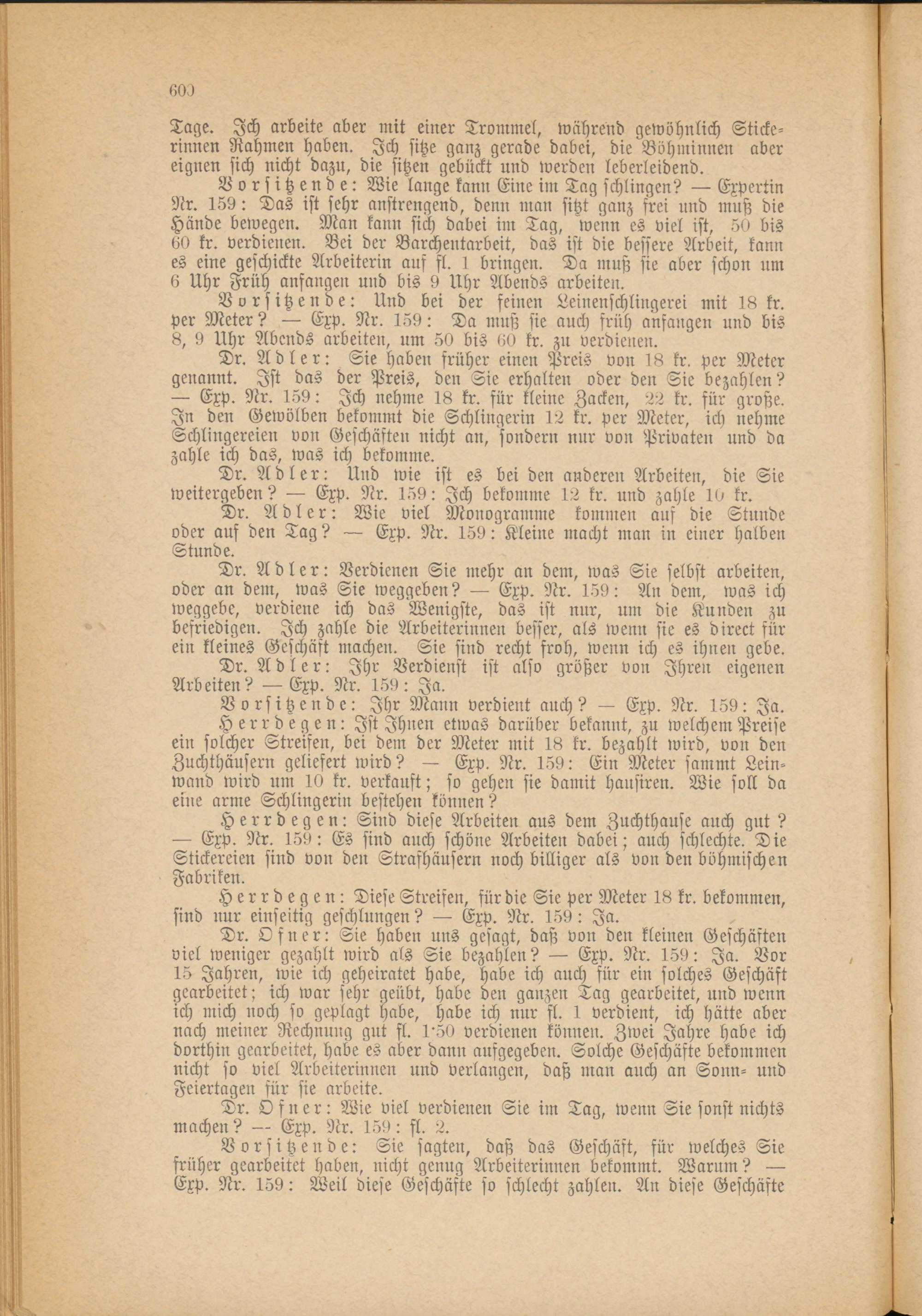 Dr. Adler: Verdienen Sie mehr an dem, was Sie selbst arbeiten, oder an dem, was Sie weggeben? — Exp. Nr. 159: An dem, was ich weggebe, verdiene ich das Wenigste, das ist nur, um die Kunden zu befriedigen. Ich zahle die Arbeiterinnen besser, als wenn sie es direct für ein kleines Geschäft machen. Sie sind recht froh, wenn ich es ihnen gebe.