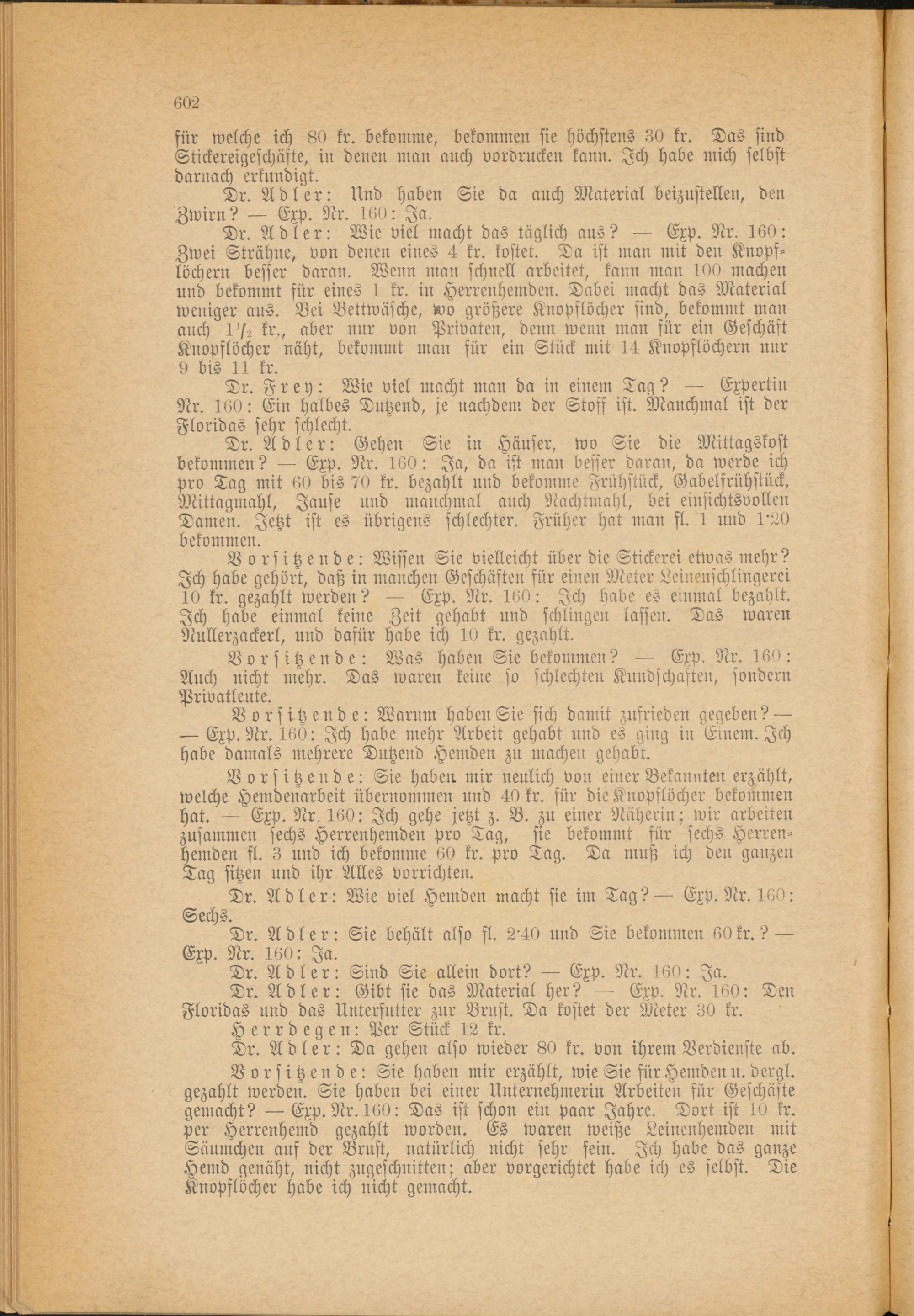 Dr. Adler: Gehen Sie in Häuser, wo Sie die Mittagskost bekommen? Exp. Nr. 160: Ja, da ist man besser daran, da werde ich pro Tag mit 60 bis 70 kr. bezahlt und bekomme Frühstück, Gabelfrühstück, Mittagmahl, Jause und manchmal auch Nachtmahl, bei einsichtsvollen Damen. Jetzt ist es übrigens schlechter. Früher hat man fl. 1 und 1'20 bekommen.