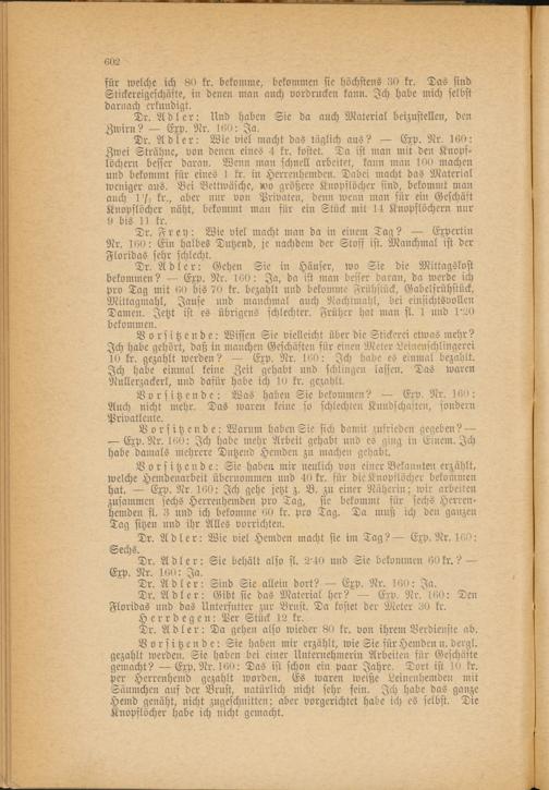 Vorsitzende: Sie haben, mir neulich von einer Bekannten erzählt, welche Hemdenarbeit übernommen und 40 kr. für die Knopflöcher bekommen hat. Exp. Nr. 160: Ich gehe jetzt z. B. zu einer Näherin; wir arbeiten zusammen sechs Herrenhemden pro Tag, sie bekommt für sechs Herren­hemden sl. 3 und ich bekomme 60 kr. Pro Tag. Da muß ich den ganzen Tag sitzen und ihr Alles vorrichten.