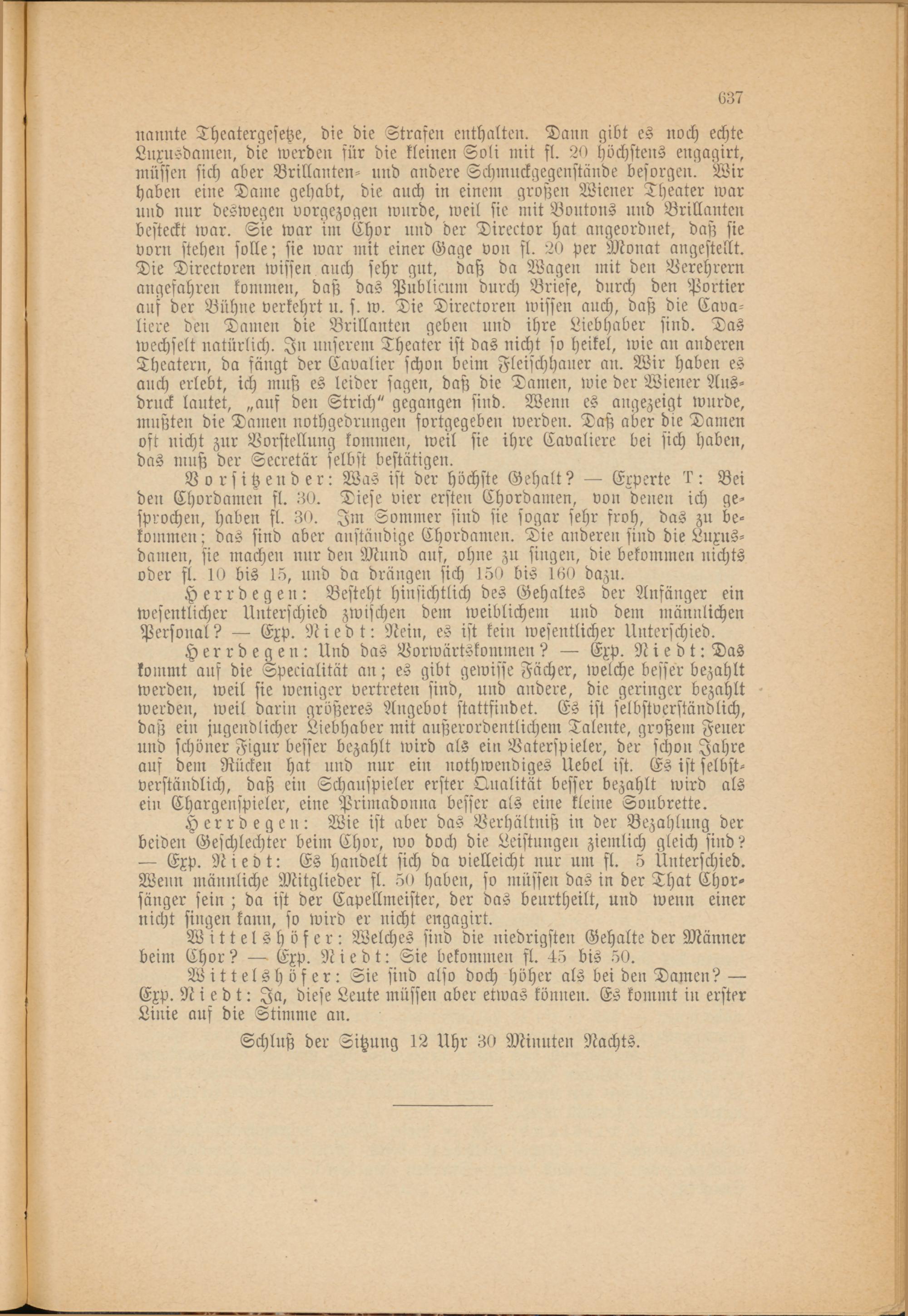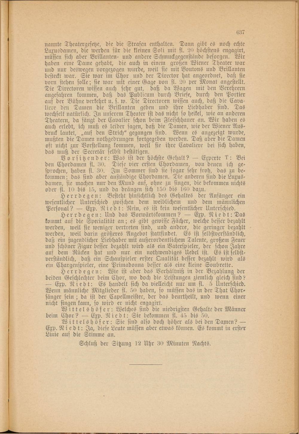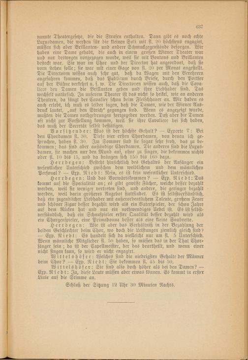 Vorsitzender: Was ist der höchste Gehalt? — Experte 4: Bei den Chordamen fl. 30. Diese vier ersten Chordamen, von denen ich gesprochen, haben fl. 30. Im Sommer sind sie sogar sehr froh, das zu bekommen ; das sind aber anständige Chordamen. Die anderen sind die Luxusdamen, sie machen nur den Mund aus, ohne zu singen, die bekommen nichts oder fl. 10 bis 15, und da drängen sich 150 bis 160 dazu.