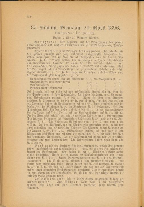 Experte Richter (über Befragen des Vorsitzenden): Ich erlaube mir den Herren zunächst eine ganz willkürlich ausgewählte Wochenliste der Löhne vorzulegen. Es ist dies die 51. Wochenliste vom 16. bis 21. December. In dieser Woche hatten wir im Ganzen im Hause 332 Arbeiter und Arbeiterinnen, darunter 42 männliche, 273 weibliche Arbeiter und 17 Lehrmädchen. Diese zusammen haben sl. 290.T75 Lohn bekommen. Aus der Liste ergibt sich als Mindestlohn bei zehnstündiger Schicht und sechs- tägiger Arbeitszeit st. 5. In den einzelnen Branchen sind die Löhne nach der Leistungsfähigkeit verschieden. In der Knopflochnäherei haben wir als Minimum st. 6, als Maximum fl. 12