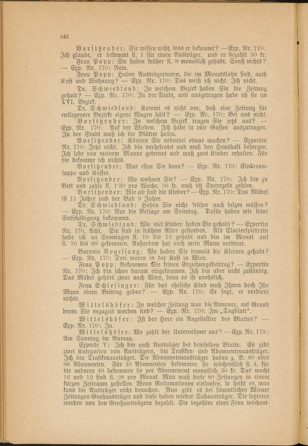 Vorsitzender: Sie wissen nicht, was er bekommt? — Exp. Nr. 170: Ich glaube, er bekommt fl. 1 für einen Austräger, und er bezahlt 50 kr. Frau Popp: Sie haben früher fl. 8 monatlich gehabt. Sonst nichts?