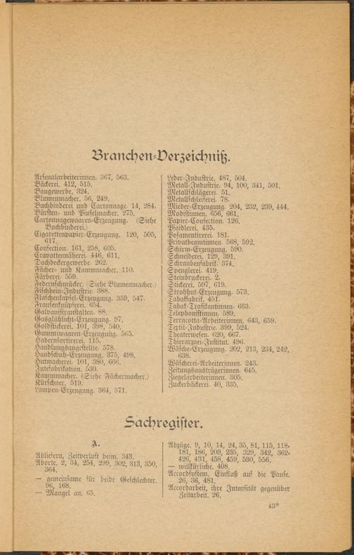 Tabak-Trankantinnen- 663. Telephonistiimen- 589. Terracotta-Arbeiterinnen. 643, 659. Textil-Industrie- 399, 524. Theaterwesen. 620, 667. Thierarznei-Jnstitut. 496. Wäsche-Erzeugung. 202, 213, 234, 242, 638.