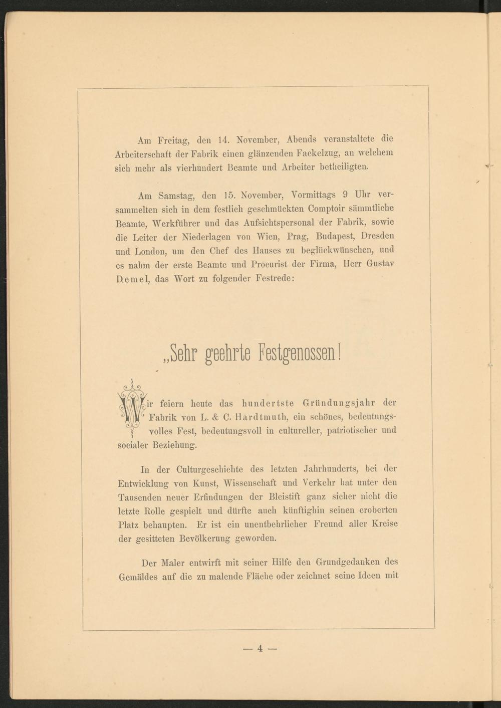 ir feiern heute das hundertste Gründungsjahr der °)([m Fabrik von L. & C. Hardtmuth, ein schönes, bedeutungs- | volles Fest, bedeutungsvoll in cultureller, patriotischer und socialer Beziehung.
