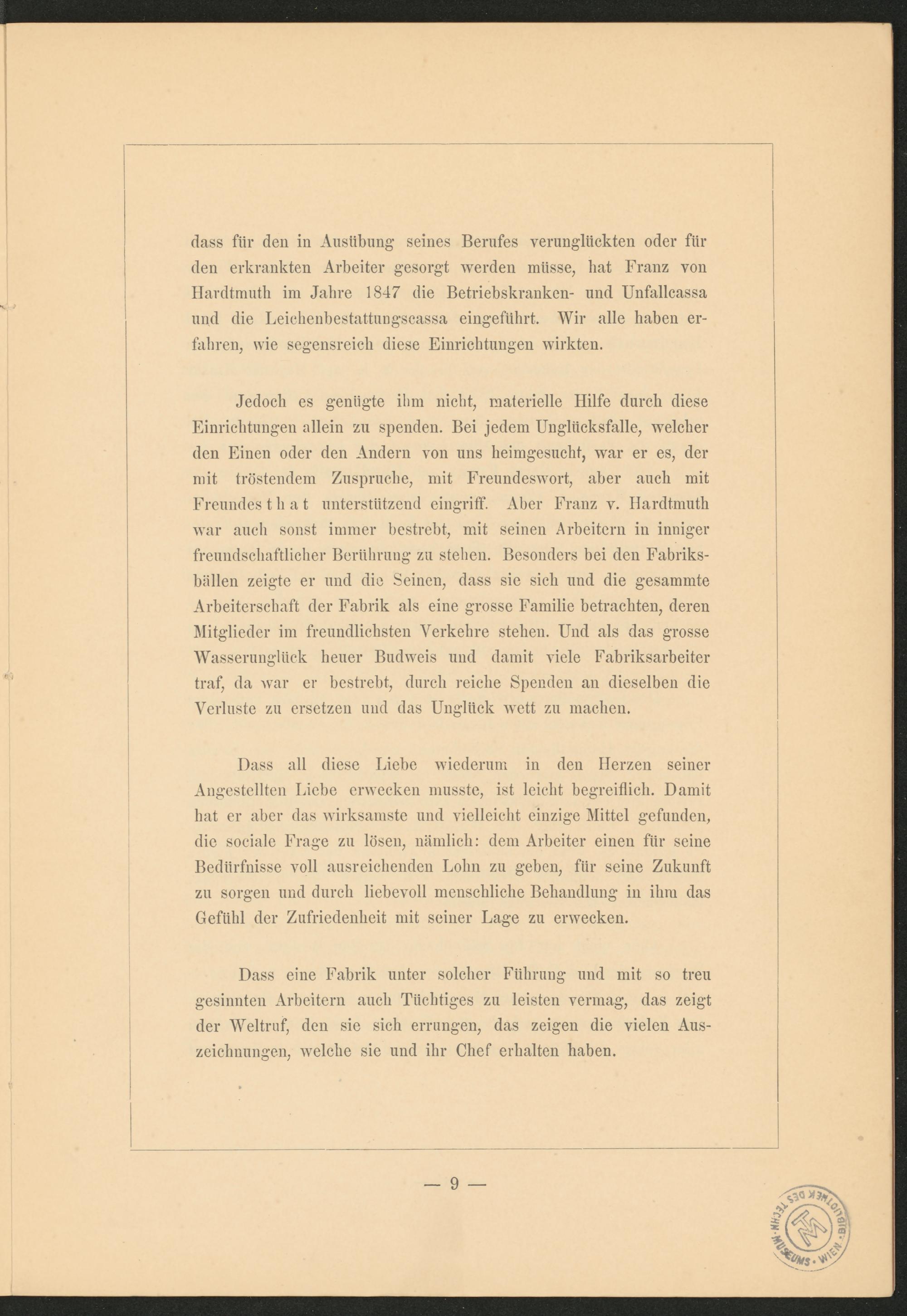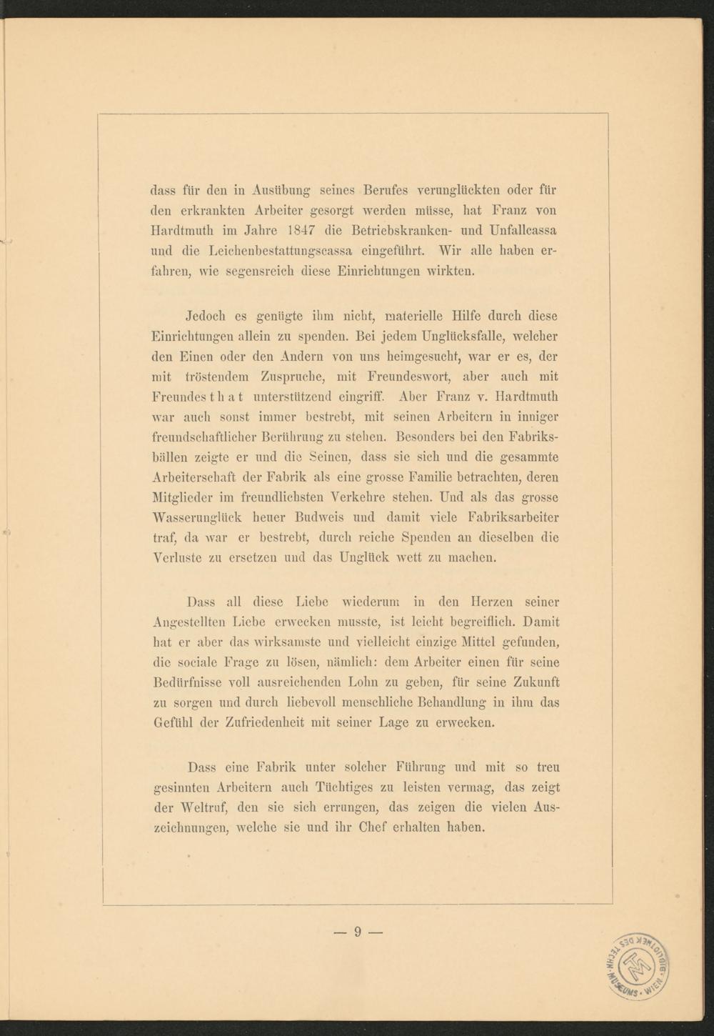 dass für den in Ausübung’ seines Berufes verunglückten oder für den erkrankten Arbeiter gesorgt werden müsse, hat Franz von Hardtmutli im Jahre 1847 die Betriebskranken- und Unfallcassa und die Leichenbestattungscassa eingeführt. Wir alle haben erfahren, wie segensreich diese Einrichtungen wirkten.