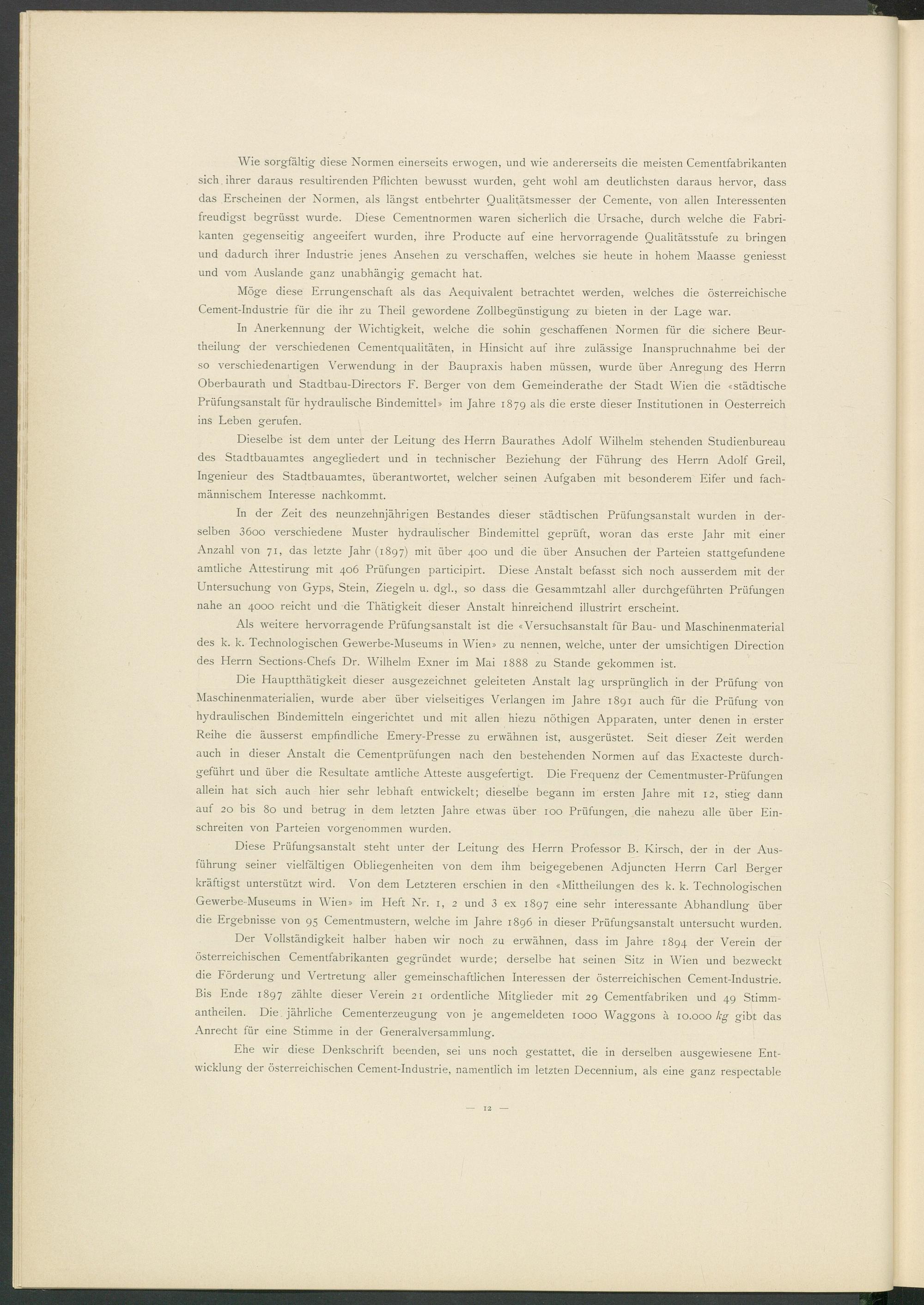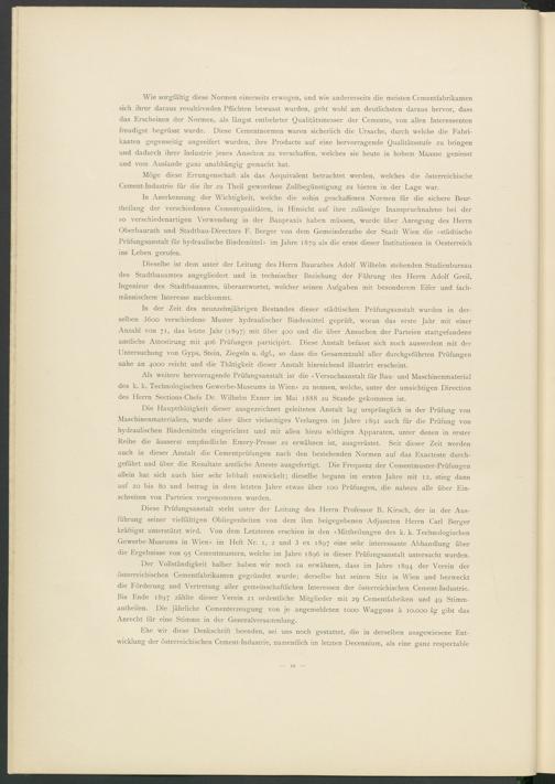 Diese Prüfungsanstalt steht unter der Leitung des Herrn Professor B. Kirsch, der in der Ausführung seiner vielfältigen Obliegenheiten von dem ihm beigegebenen Adjuncten Herrn Carl Berger kräftigst unterstützt wird. Von dem Letzteren erschien in den «Mittheilungen des k. k. Technologischen Gewerbe-Museums in Wien» im Heft Nr. 1, 2 und 3 ex 1897 eine sehr interessante Abhandlung über die Ergebnisse von 95 Cementmustern, welche im Jahre 1896 in dieser Prüfungsanstalt untersucht wurden.