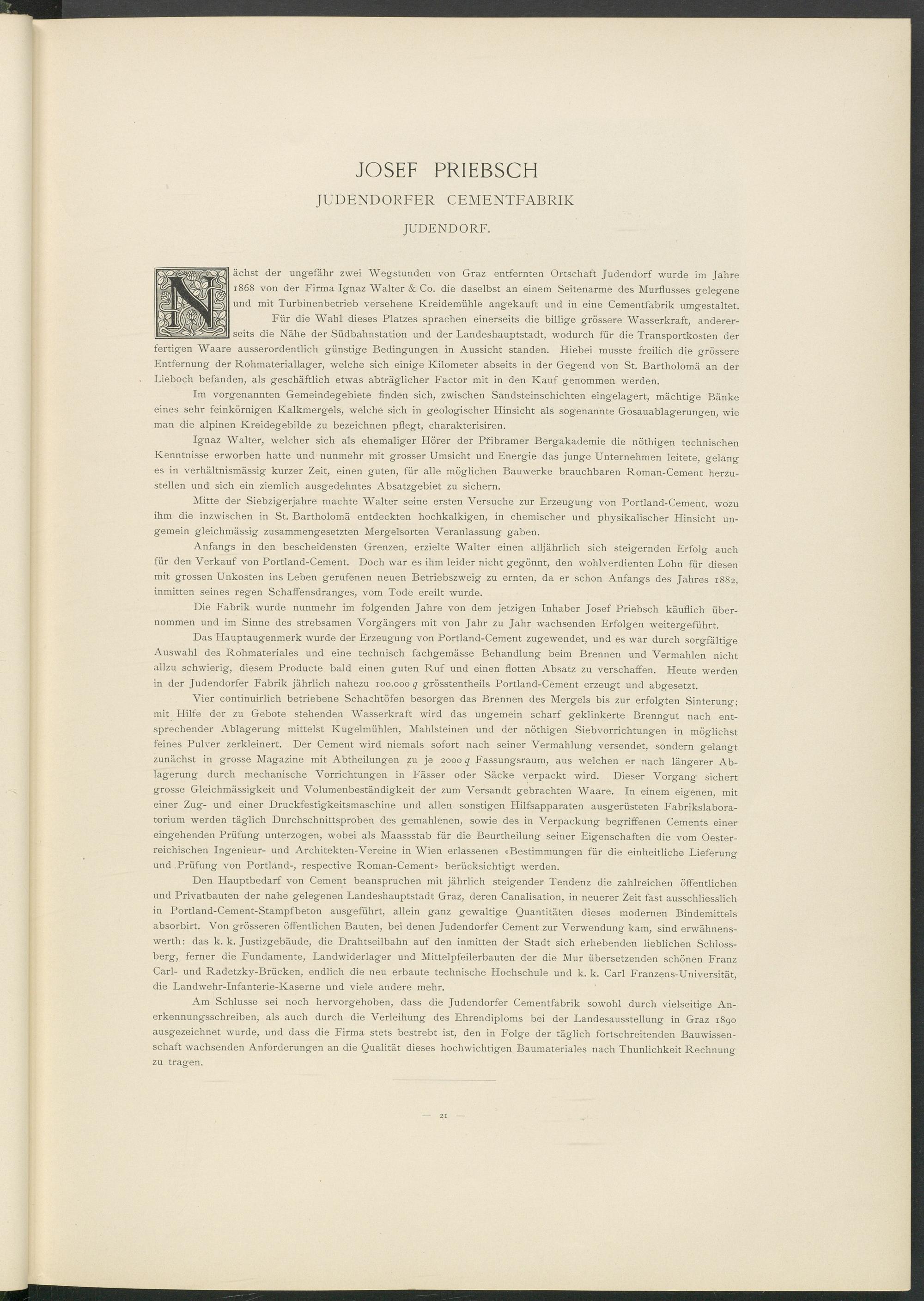 Am Schlüsse sei noch hervorgehoben, dass die Judendorfer Cementfabrik sowohl durch vielseitige Anerkennungsschreiben, als auch durch die Verleihung des Ehrendiploms bei der Landesausstellung in Graz 1890 ausgezeichnet wurde, und dass die Firma stets bestrebt ist, den in Folge der täglich fortschreitenden Bauwissenschaft wachsenden Anforderungen an die Qualität dieses hochwichtigen Baumateriales nach Thunlichkeit Rechnung zu tragen.