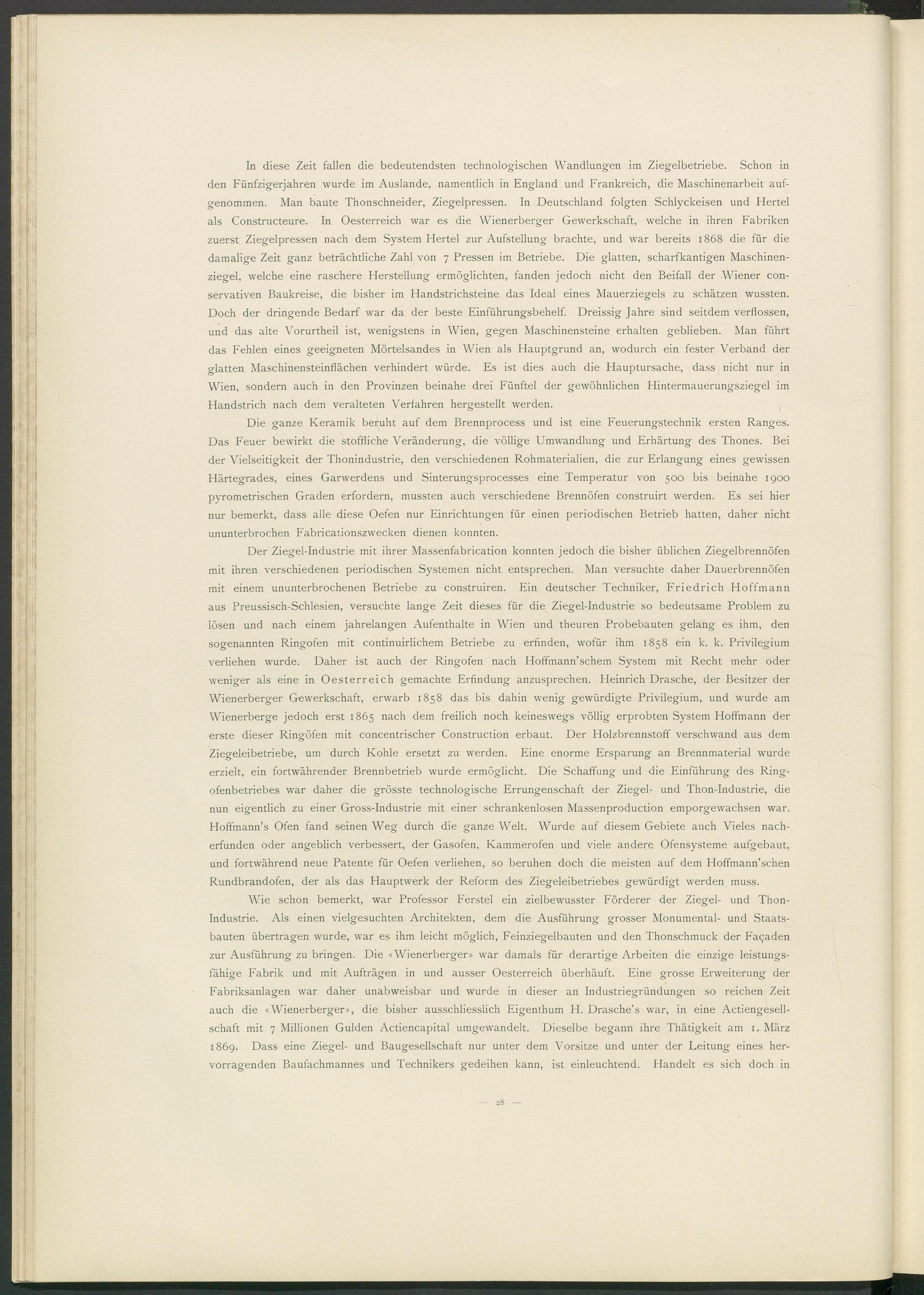 Der Ziegel-Industrie mit ihrer Massenfabrication konnten jedoch die bisher üblichen Ziegelbrennöfen mit ihren verschiedenen periodischen Systemen nicht entsprechen. Man versuchte daher Dauerbrennöfen mit einem ununterbrochenen Betriebe zu construiren. Ein deutscher Techniker, Friedrich Hoffmann aus Preussisch-Schlesien, versuchte lange Zeit dieses für die Ziegel-Industrie so bedeutsame Problem zu lösen und nach einem jahrelangen Aufenthalte in Wien und theuren Probebauten gelang es ihm, den sogenannten Ringofen mit continuirlichem Betriebe zu erfinden, wofür ihm 1858 ein k. k. Privilegium verliehen wurde. Daher ist auch der Ringofen nach Hoffmann’schem System mit Recht mehr oder weniger als eine in Oesterreich gemachte Erfindung anzusprechen. Heinrich Dräsche, der Besitzer der Wienerberger Gewerkschaft, erwarb 1858 das bis dahin wenig gewürdigte Privilegium, und wurde am Wienerberge jedoch erst 1865 nach dem freilich noch keineswegs völlig erprobten System Hoffmann der erste dieser Ringöfen mit concentrischer Construction erbaut. Der Holzbrennstoff verschwand aus dem Ziegeleibetriebe, um durch Kohle ersetzt zu werden. Eine enorme Ersparung an Brennmaterial wurde erzielt, ein fortwährender Brennbetrieb wurde ermöglicht. Die Schaffung und die Einführung des Ringofenbetriebes war daher die grösste technologische Errungenschaft der Ziegel- und Thon-Industrie, die nun eigentlich zu einer Gross-Industrie mit einer schrankenlosen Massenproduction emporgewachsen war. Hoffmann’s Ofen fand seinen Weg durch die ganze Welt. Wurde auf diesem Gebiete auch Vieles nacherfunden oder angeblich verbessert, der Gasofen, Kammerofen und viele andere Ofensysteme aufgebaut, und fortwährend neue Patente für Oefen verliehen, so beruhen doch die meisten auf dem Hoffmann’schen Rundbrandofen, der als das Hauptwerk der Reform des Ziegeleibetriebes gewürdigt werden muss.