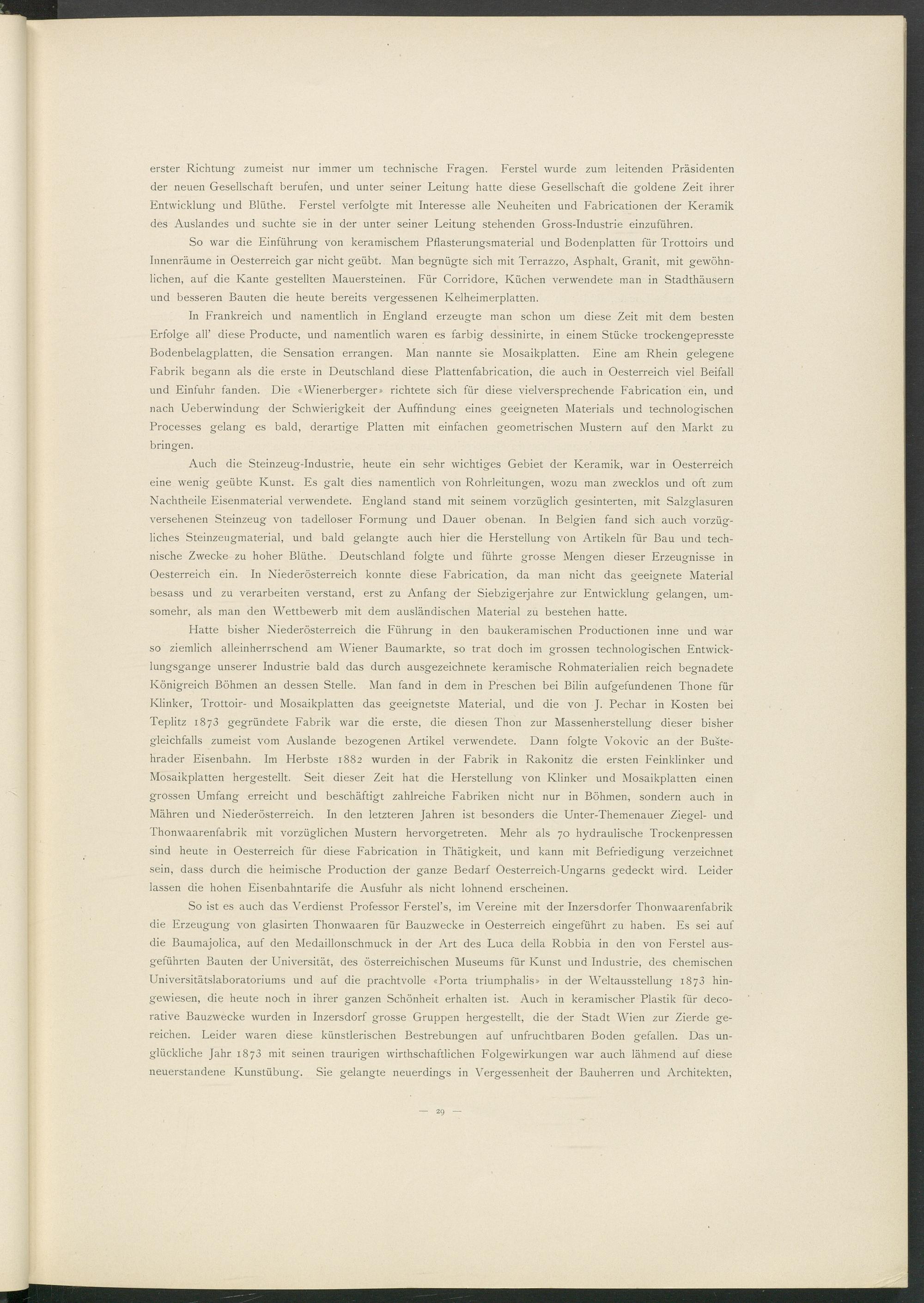 So war die Einführung von keramischem Pflasterungsmaterial und Bodenplatten für Trottoirs und Innenräume in Oesterreich gar nicht geübt. Man begnügte sich mit Terrazzo, Asphalt, Granit, mit gewöhnlichen, auf die Kante gestellten Mauersteinen. Für Corridore, Küchen verwendete man in Stadthäusern und besseren Bauten die heute bereits vergessenen Kelheimerplatten.