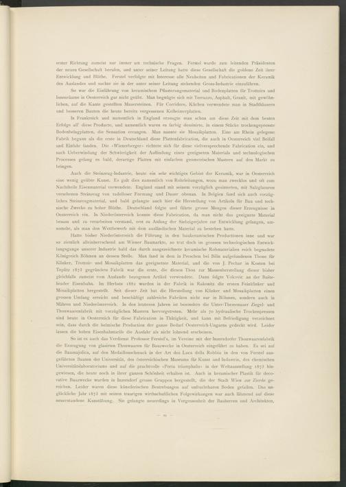 So ist es auch das Verdienst Professor Ferstel’s, im Vereine mit der Inzersdorfer Thonwaarenfabrik die Erzeugung von glasirten Thonwaaren für Bauzwecke in Oesterreich eingeführt zu haben. Es sei auf die Baumajolica, auf den Medaillonschmuck in der Art des Luca della Robbia in den von Ferstel ausgeführten Bauten der Universität, des österreichischen Museums für Kunst und Industrie, des chemischen Universitätslaboratoriums und auf die prachtvolle «Porta triumphalis» in der Weltausstellung 187 3 hingewiesen, die heute noch in ihrer ganzen Schönheit erhalten ist. Auch in keramischer Plastik für deco- rative Bauzwecke wurden in Inzersdorf grosse Gruppen hergestellt, die der Stadt Wien zur Zierde gereichen. Leider waren diese künstlerischen Bestrebungen auf unfruchtbaren Boden gefallen. Das un- glückliche Jahr 1873 mit seinen traurigen wirthschaftlichen Folge Wirkungen war auch lähmend auf diese neuerstandene Kunstübung. Sie gelangte neuerdings in Vergessenheit der Bauherren und Architekten,