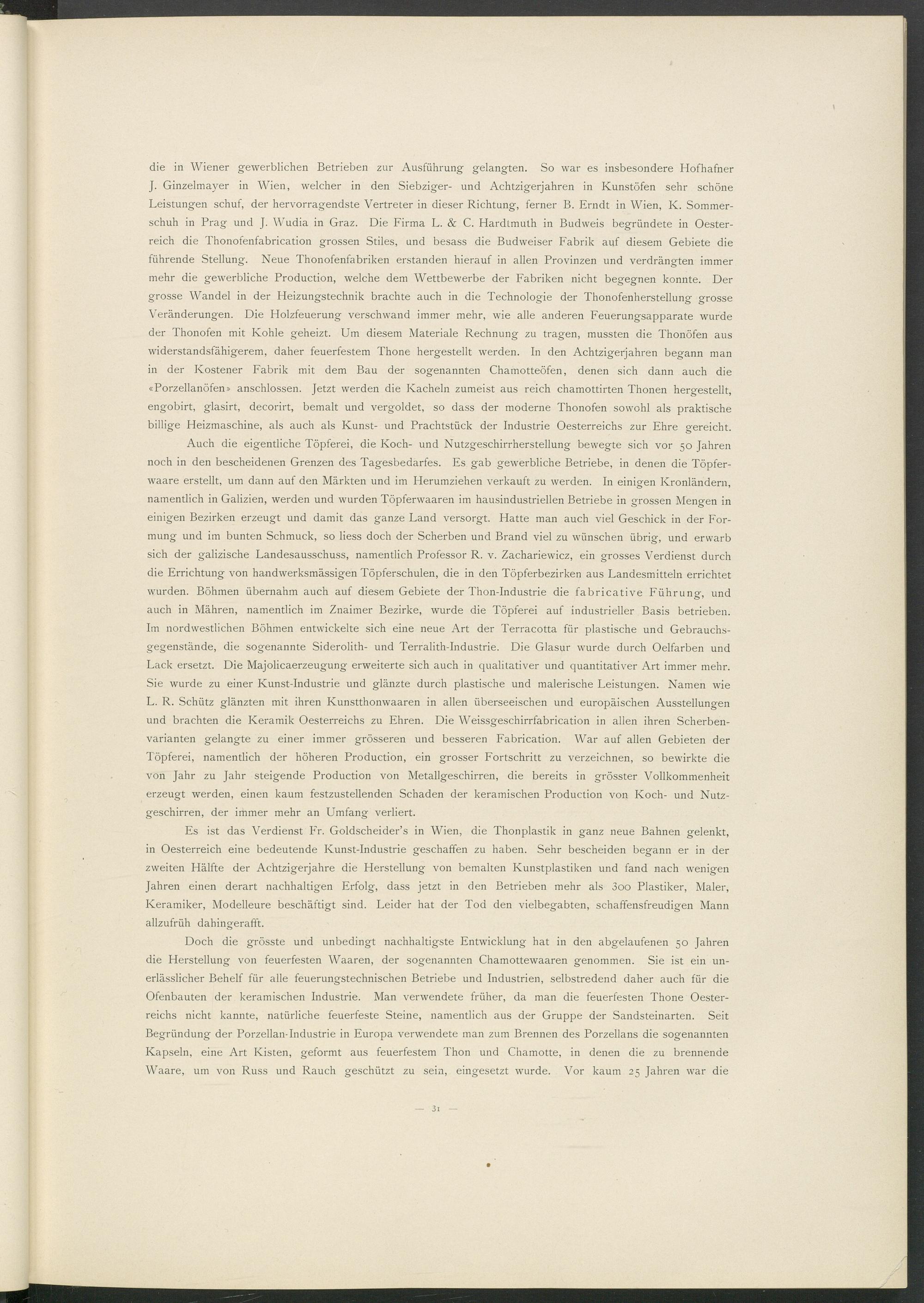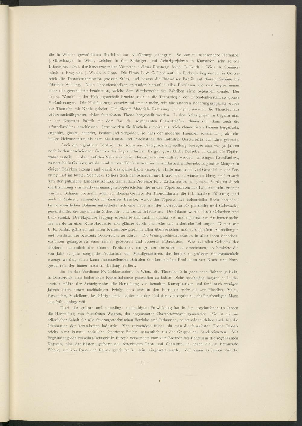 die in Wiener gewerblichen Betrieben zur Ausführung gelangten. So war es insbesondere Hofhafner J. Ginzelmayer in Wien, welcher in den Siebziger- und Achtzigerjahren in Kunstöfen sehr schöne Leistungen schuf, der hervorragendste Vertreter in dieser Richtung, ferner B. Erndt in Wien, K. Sommerschuh in Prag und J. Wudia in Graz. Die Firma L. & C. Hardlmuth in Budweis begründete in Oesterreich die Thonofenfabrication grossen Stiles, und besass die Budweiser Fabrik auf diesem Gebiete die führende Stellung. Neue Thonofenfabriken erstanden hierauf in allen Provinzen und verdrängten immer mehr die gewerbliche Production, welche dem Wettbewerbe der Fabriken nicht begegnen konnte. Der grosse Wandel in der Heizungstechnik brachte auch in die Technologie der Thonofenherstellung grosse Veränderungen. Die Holzfeuerung verschwand immer mehr, wie alle anderen Feuerungsapparate wurde der Thonofen mit Kohle geheizt. Um diesem Materiale Rechnung zu tragen, mussten die Thonöfen aus widerstandsfähigerem, daher feuerfestem Thone hergestellt werden. In den Achtzigerjahren begann man in der Kostener Fabrik mit dem Bau der sogenannten Chamotteöfen, denen sich dann auch die «Porzellanöfen» anschlossen. Jetzt werden die Kacheln zumeist aus reich chamottirten Thonen hergestellt, engobirt, glasirt, decorirt, bemalt und vergoldet, so dass der moderne Thonofen sowohl als praktische billige Heizmaschine, als auch als Kunst- und Prachtstück der Industrie Oesterreichs zur Ehre gereicht.