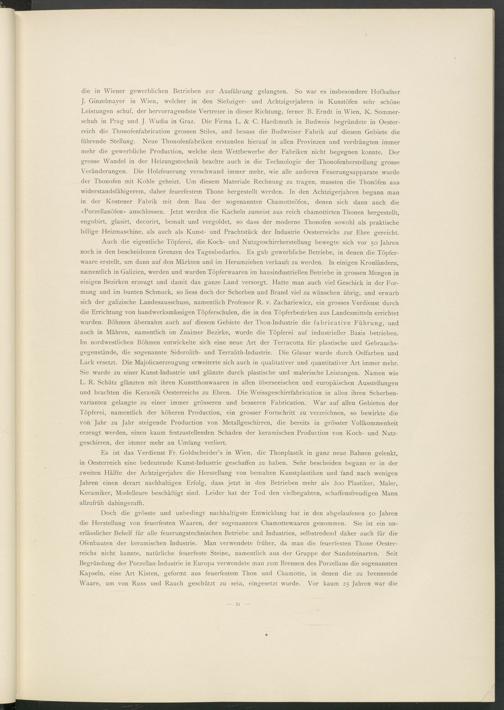 Doch die grösste und unbedingt nachhaltigste Entwicklung hat in den abgelaufenen 50 Jahren die Herstellung von feuerfesten Waaren, der sogenannten Chamottewaaren genommen. Sie ist ein unerlässlicher Behelf für alle feuerungstechnischen Betriebe und Industrien, selbstredend daher auch für die Ofenbauten der keramischen Industrie. Man verwendete früher, da man die feuerfesten Thone Oesterreichs nicht kannte, natürliche feuerfeste Steine, namentlich aus der Gruppe der Sandsteinarten. Seit Begründung der Porzellan-Industrie in Europa verwendete man zum Brennen des Porzellans die sogenannten Kapseln, eine Art Kisten, geformt aus feuerfestem Thon und Chamotte, in denen die zu brennende Waare, um von Russ und Rauch geschützt zu sein, eingesetzt wurde. Vor kaum 25 Jahren war die