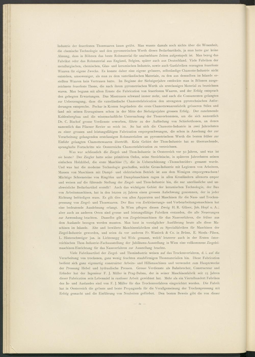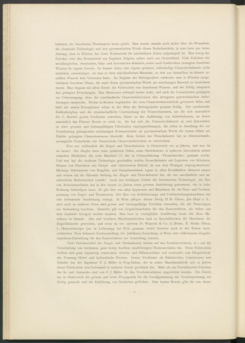 Industrie der feuerfesten Thonwaaren kaum geübt. Man wusste damals noch nichts über die Wesenheit, die chemische Technologie und den pyrometrischen Werth dieses Bedarfsartikels, ja man hatte gar keine Ahnung, dass in Böhmen das beste Rohmaterial für unabsehbare Zeiten aufgestapelt ist. Man bezog das Fabrikat oder das Rohmaterial aus England, Belgien, später auch aus Deutschland. Viele Fabriken der metallurgischen, chemischen, Glas- und keramischen Industrie, sowie auch Gasfabriken erzeugten feuerfeste Waaren für eigene Zwecke. Es konnte daher eine eigene grössere, selbständige Chamotte-Industrie nicht entstehen, umsoweniger, als man zu dem vaterländischen Materiale, zu den aus demselben im Inlande erstellten Waaren kein Vertrauen hatte. Im Beginne der Siebzigerjahre entdeckte man in Böhmen ausgezeichnete feuerfeste Thone, die nach ihrem pyrometrischen Werth als erstclassiges Material zu bezeichnen waren. Man begann mit allem Ernste die Fabrication von feuerfesten Waaren, und der Erfolg entsprach den gehegten Erwartungen. Das Misstrauen schwand immer mehr, und auch die Consumenten gelangten zur Ueberzeugung, dass die vaterländische Chamottefabrication den strengsten pyrotechnischen Anforderungen entspreche. Pechar in Kosten begründete die erste Chamottewaarenfabrik grösseren Stiles und fand mit seinen Erzeugnissen schon in der Mitte der Siebzigerjahre grossen Erfolg. Der zunehmende Kohlenbergbau und die wissenschaftliche Untersuchung der Thonvorkommen, um die sich namentlich Dr. C. Bischof grosse Verdienste erworben, führte zu der Auffindung von Schieferthonen, an denen namentlich das Pilsener Revier so reich ist. So hat sich die Chamotte-Industrie in zwei Jahrzehnten zu einer grossen und leistungsfähigen Fabrication emporgeschwungen, die schon in Ansehung der zur Verarbeitung gelangenden erstclassigen Rohmaterialien an pyrometrischem Werth die besten früher zur Einfuhr gelangten Chamottewaaren übertrifft. Kein Gebiet der Thon-Industrie hat so überraschende, sprunghafte Fortschritte wie Oesterreichs Chamottefabrication zu verzeichnen.