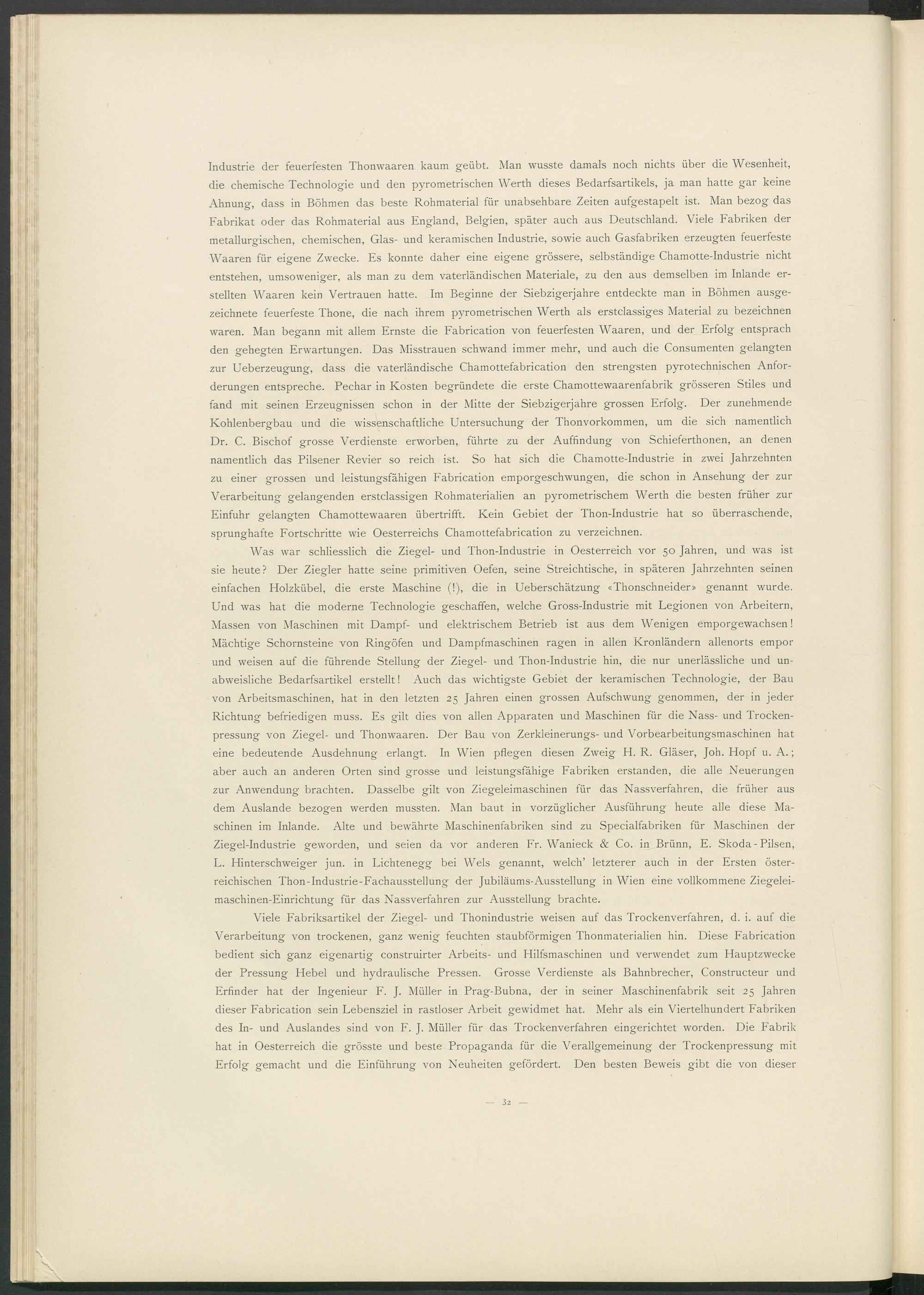 Viele Fabriksartikel der Ziegel- und Thonindustrie weisen auf das Trockenverfahren, d. i. auf die Verarbeitung von trockenen, ganz wenig feuchten staubförmigen Thonmaterialien hin. Diese Fabrication bedient sich ganz eigenartig construirter Arbeits- und Hilfsmaschinen und verwendet zum Hauptzwecke der Pressung Hebel und hydraulische Pressen. Grosse Verdienste als Bahnbrecher, Constructeur und Erfinder hat der Ingenieur F. J. Müller in Prag-Bubna, der in seiner Maschinenfabrik seit 25 Jahren dieser Fabrication sein Lebensziel in rastloser Arbeit gewidmet hat. Mehr als ein Viertelhundert Fabriken des In- und Auslandes sind von F. J. Müller für das Trockenverfahren eingerichtet worden. Die Fabrik hat in Oesterreich die grösste und beste Propaganda für die Verallgemeinung der Trockenpressung mit Erfolg gemacht und die Einführung von Neuheiten gefördert. Den besten Beweis gibt die von dieser