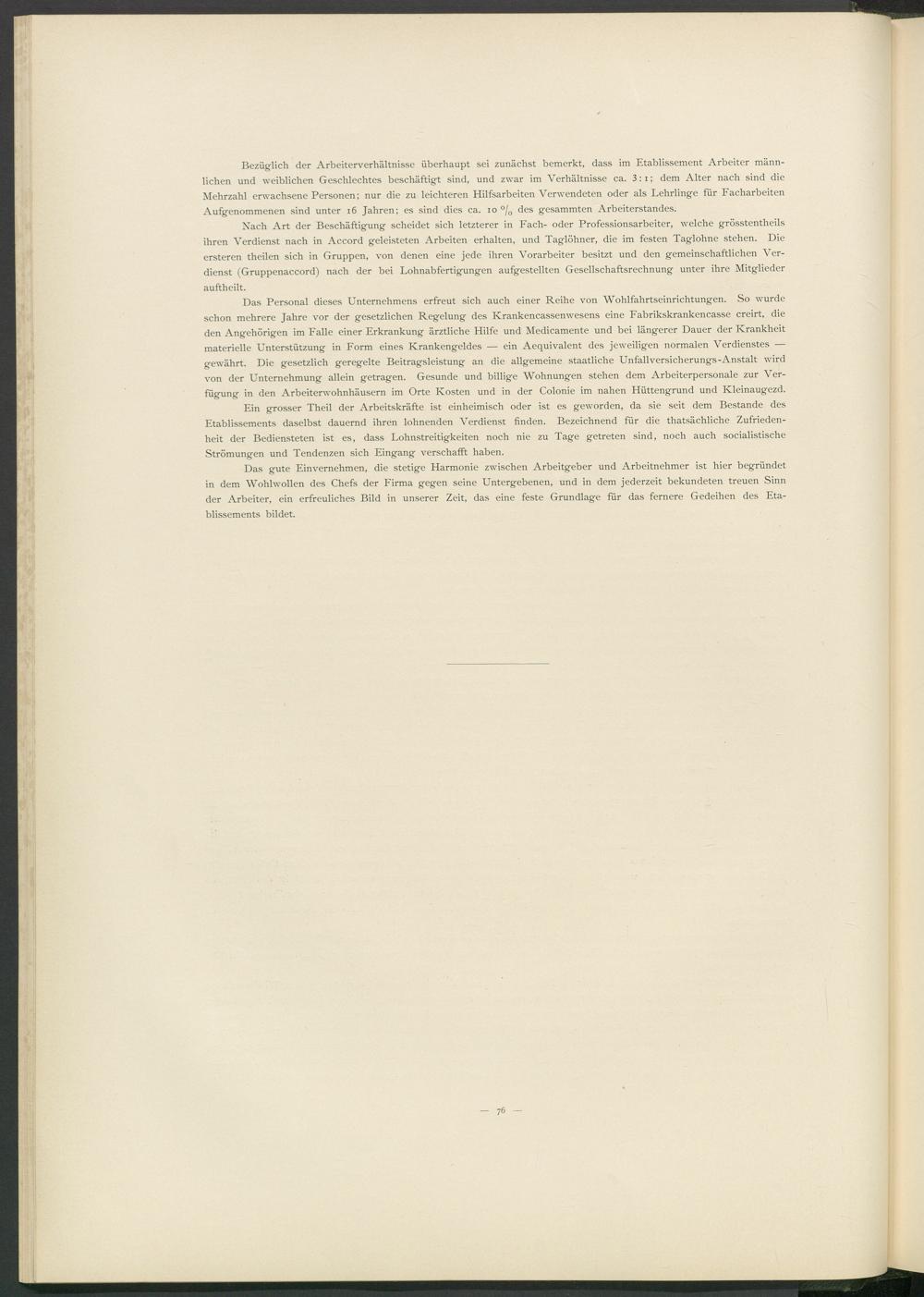 Ein grosser Theil der Arbeitskräfte ist einheimisch oder ist es geworden, da sie seit dem Bestände des Etablissements daselbst dauernd ihren lohnenden Verdienst finden. Bezeichnend für die thatsächliche Zufriedenheit der Bediensteten ist es, dass Lohnstreitigkeiten noch nie zu Tage getreten sind, noch auch socialistische Strömungen und Tendenzen sich Eingang verschafft haben.