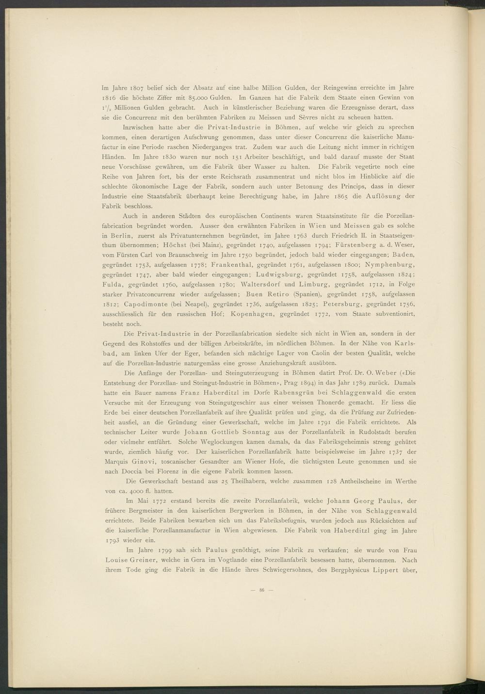 Die Anfänge der Porzellan- und Steinguterzeugung in Böhmen datirt Prof. Dr. O. Weber («Die Entstehung der Porzellan- und Steingut-Industrie in Böhmen», Prag 1894) in das Jahr 1789 zurück. Damals hatte ein Bauer namens Franz Haberditzl im Dorfe Rabensgrün bei Schlaggenwald die ersten Versuche mit der Erzeugung von Steingutgeschirr aus einer weissen Thonerde gemacht. Er Hess die Erde bei einer deutschen Porzellanfabrik auf ihre Qualität prüfen und ging, da die Prüfung zur Zufriedenheit ausfiel, an die Gründung einer Gewerkschaft, welche im Jahre 1791 die Fabrik errichtete. Als technischer Leiter wurde Johann Gottlieb Sonntag aus der Porzellanfabrik in Rudolstadt berufen oder vielmehr entführt. Solche Weglockungen kamen damals, da das Fabriksgeheimnis streng gehütet wurde, ziemlich häufig vor. Der kaiserlichen Porzellanfabrik hatte beispielsweise im Jahre 1737 der Marquis Ginovi, toscanischer Gesandter am Wiener Hofe, die tüchtigsten Leute genommen und sie nach Doccia bei Florenz in die eigene Fabrik kommen lassen.