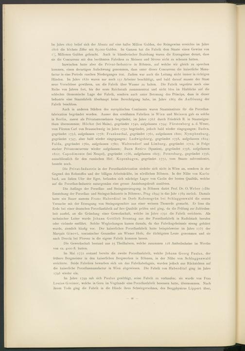 Auch in anderen Städten des europäischen Continents waren Staatsinstitute für die Porzellan- fabrication begründet worden. Ausser den erwähnten Fabriken in Wien und Meissen gab es solche in Berlin, zuerst als Privatunternehmen begründet, im Jahre 1763 durch Friedrich II. in Staatseigenthum übernommen; Höchst (bei Mainz), gegründet 1740, aufgelassen 1794; Fürstenberg a. d. Weser, vom Fürsten Carl von Braunschweig im Jahre 1750 begründet, jedoch bald wieder eingegangen; Baden, gegründet 1753, aufgelassen 1778; Frankenthal, gegründet 1761, aufgelassen 1800; Nymphenburg, gegründet 1747, aber bald wieder eingegangen; Ludwigsburg, gegründet 1758, aufgelassen 1824; Fulda, gegründet 1760, aufgelassen 1780; Waltersdorf und Limburg, gegründet 1712, in Folge starker Privatconcurrenz wieder aufgelassen; Buen Retiro (Spanien), gegründet 1758, aufgelassen 1812; Capodimonte (bei Neapel), gegründet 1736, aufgelassen 1825; Petersburg, gegründet 1756, ausschliesslich für den russischen Hof; Kopenhagen, gegründet 1772, vom Staate subventionirt, besteht noch.