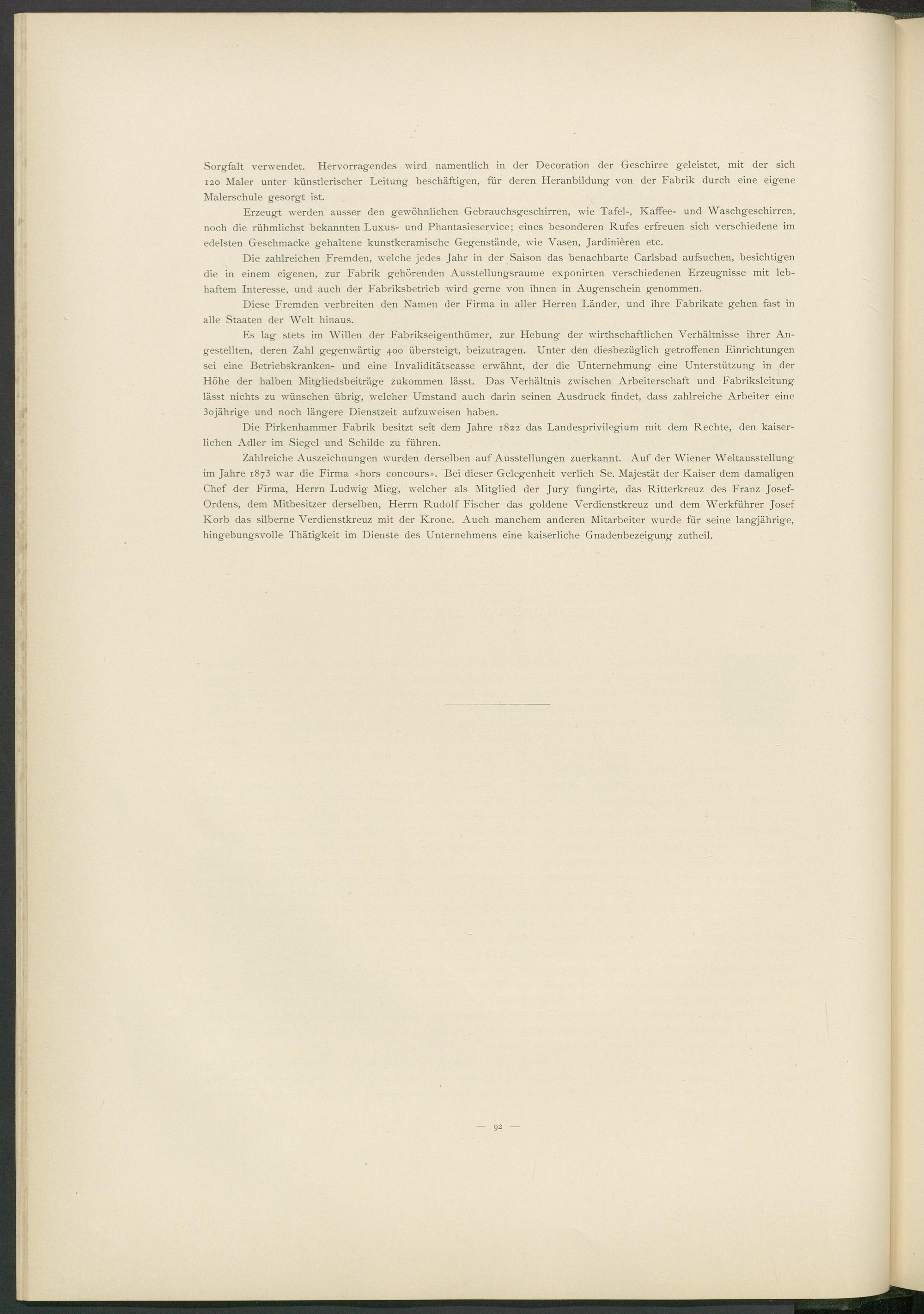 Die zahlreichen Fremden, welche jedes Jahr in der Saison das benachbarte Carlsbad aufsuchen, besichtigen die in einem eigenen, zur Fabrik gehörenden Ausstellungsräume exponirten verschiedenen Erzeugnisse mit lebhaftem Interesse, und auch der Fabriksbetrieb wird gerne von ihnen in Augenschein genommen.