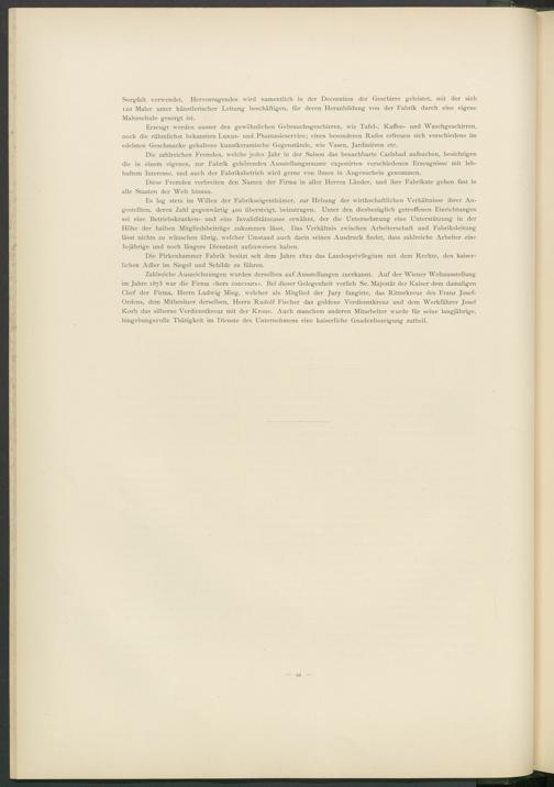 Sorgfalt verwendet. Hervorragendes wird namentlich in der Decoration der Geschirre geleistet, mit der sich 120 Maler unter künstlerischer Leitung beschäftigen, für deren Heranbildung von der Fabrik durch eine eigene Malerschule gesorgt ist.