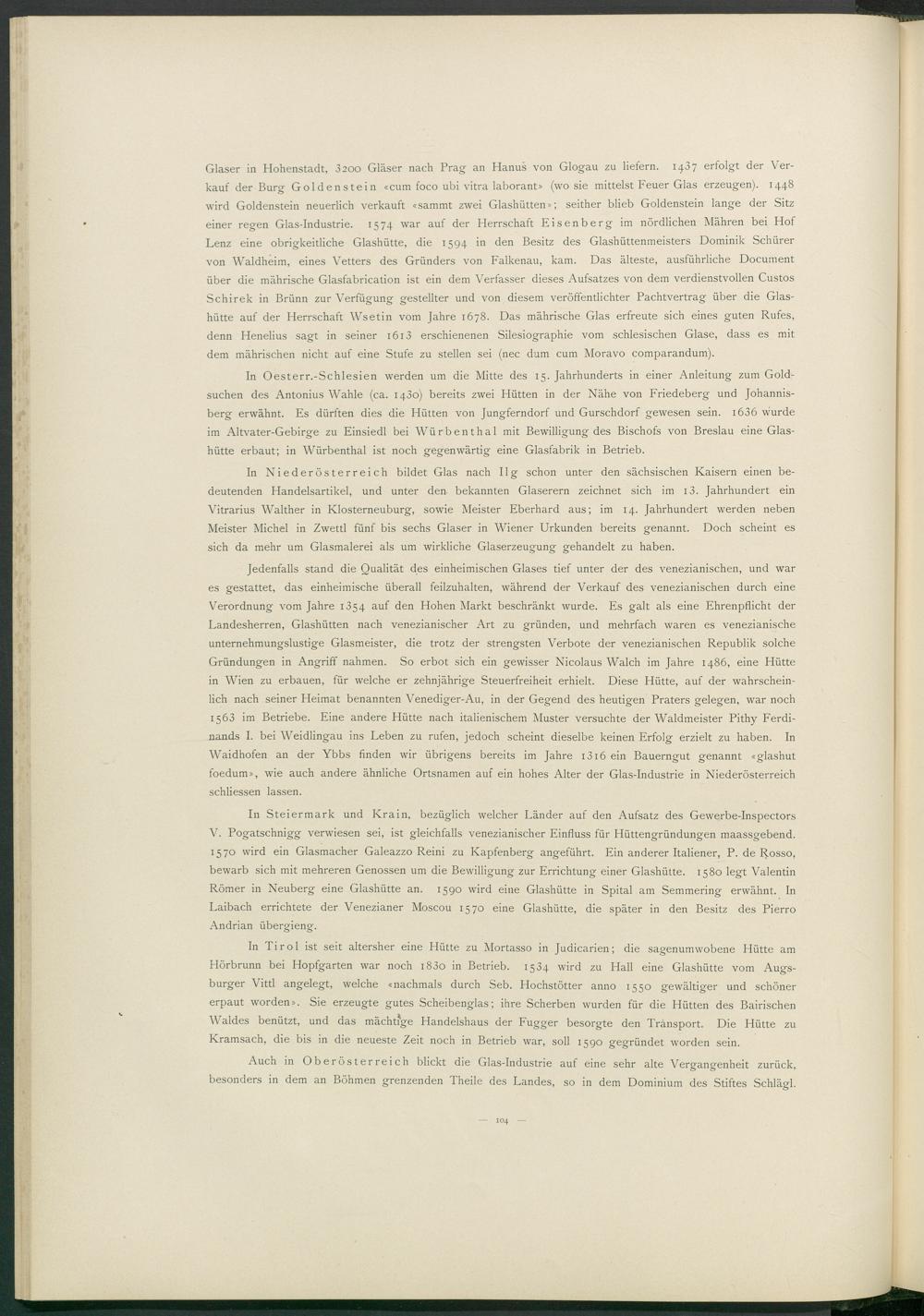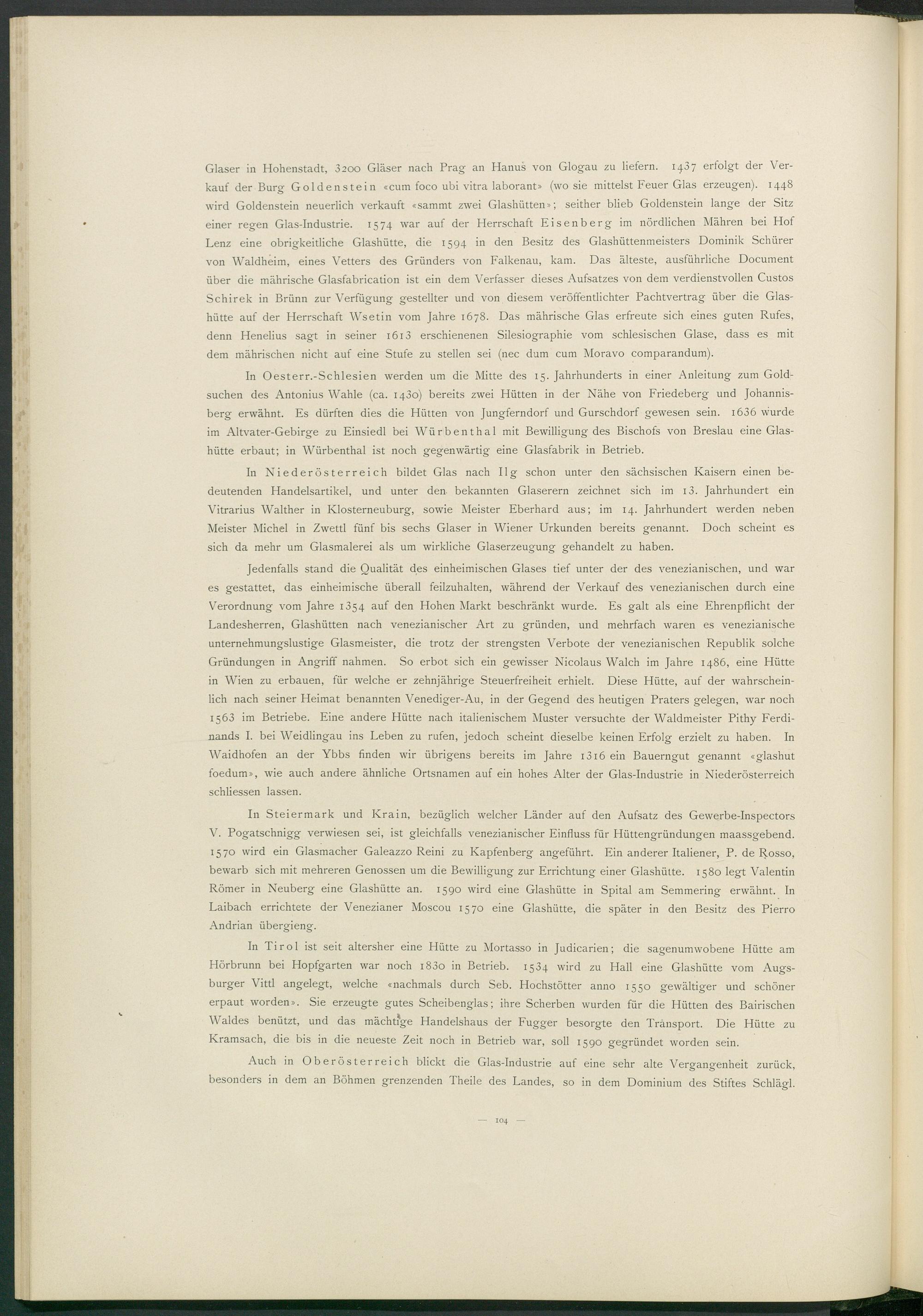 Glaser in Hohenstadt, 3200 Gläser nach Prag an Hanus von Glogau zu liefern. 1407 erfolgt der Verkauf der Bure Goldenstein «cum foco ubi vitra laborant» (wo sie mittelst Feuer Glas erzeugen). 1448 wird Goldenstein neuerlich verkauft «sammt zwei Glashütten»; seither blieb Goldenstein lange der Sitz einer regen Glas-Industrie. 1574 war auf der Herrschaft Eisenberg im nördlichen Mähren bei Hof Lenz eine obrigkeitliche Glashütte, die 1594 in den Besitz des Glashüttenmeisters Dominik Schürer von Waldheim, eines Vetters des Gründers von Falkenau, kam. Das älteste, ausführliche Document über die mährische Glasfabrication ist ein dem Verfasser dieses Aufsatzes von dem verdienstvollen Custos Schirek in Brünn zur Verfügung gestellter und von diesem veröffentlichter Pachtvertrag über die Glashütte auf der Herrschaft Wsetin vom Jahre 1678. Das mährische Glas erfreute sich eines guten Rufes, denn Henelius sagt in seiner 1613 erschienenen Silesiographie vom schlesischen Glase, dass es mit dem mährischen nicht auf eine Stufe zu stellen sei (nec dum cum Moravo comparandum).