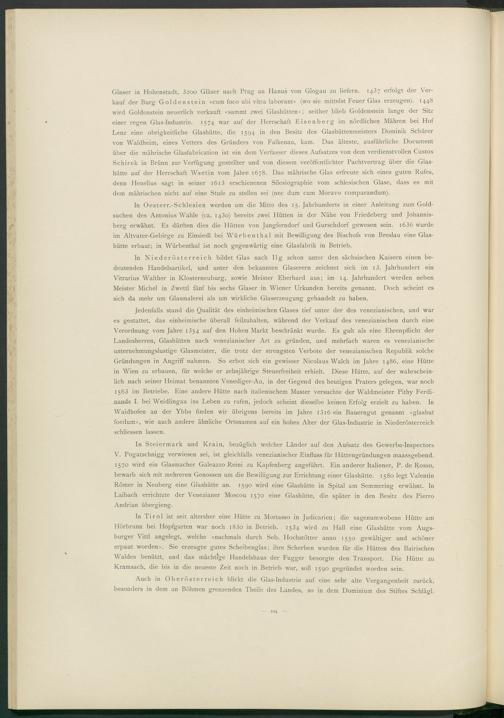 Jedenfalls stand die Qualität des einheimischen Glases tief unter der des venezianischen, und war es gestattet, das einheimische überall feilzuhalten, während der Verkauf des venezianischen durch eine Verordnung vom Jahre 1354 auf den Hohen Markt beschränkt wurde. Es galt als eine Ehrenpflicht der Landesherren, Glashütten nach venezianischer Art zu gründen, und mehrfach waren es venezianische unternehmungslustige Glasmeister, die trotz der strengsten Verbote der venezianischen Republik solche Gründungen in Angriff nahmen. So erbot sich ein gewisser Nicolaus Walch im Jahre i486, eine Hütte in Wien zu erbauen, für welche er zehnjährige Steuerfreiheit erhielt. Diese Hütte, auf der wahrscheinlich nach seiner Heimat benannten Venediger-Au, in der Gegend des heutigen Praters gelegen, war noch 1563 im Betriebe. Eine andere Hütte nach italienischem Muster versuchte der Waldmeister Pithy Ferdinands I. bei Weidlingau ins Leben zu rufen, jedoch scheint dieselbe keinen Erfolg erzielt zu haben. In Waidhofen an der Ybbs finden wir übrigens bereits im Jahre 1316 ein Bauerngut genannt «glashut foedum», wie auch andere ähnliche Ortsnamen auf ein hohes Alter der Glas-Industrie in Niederösterreich schliessen lassen.
