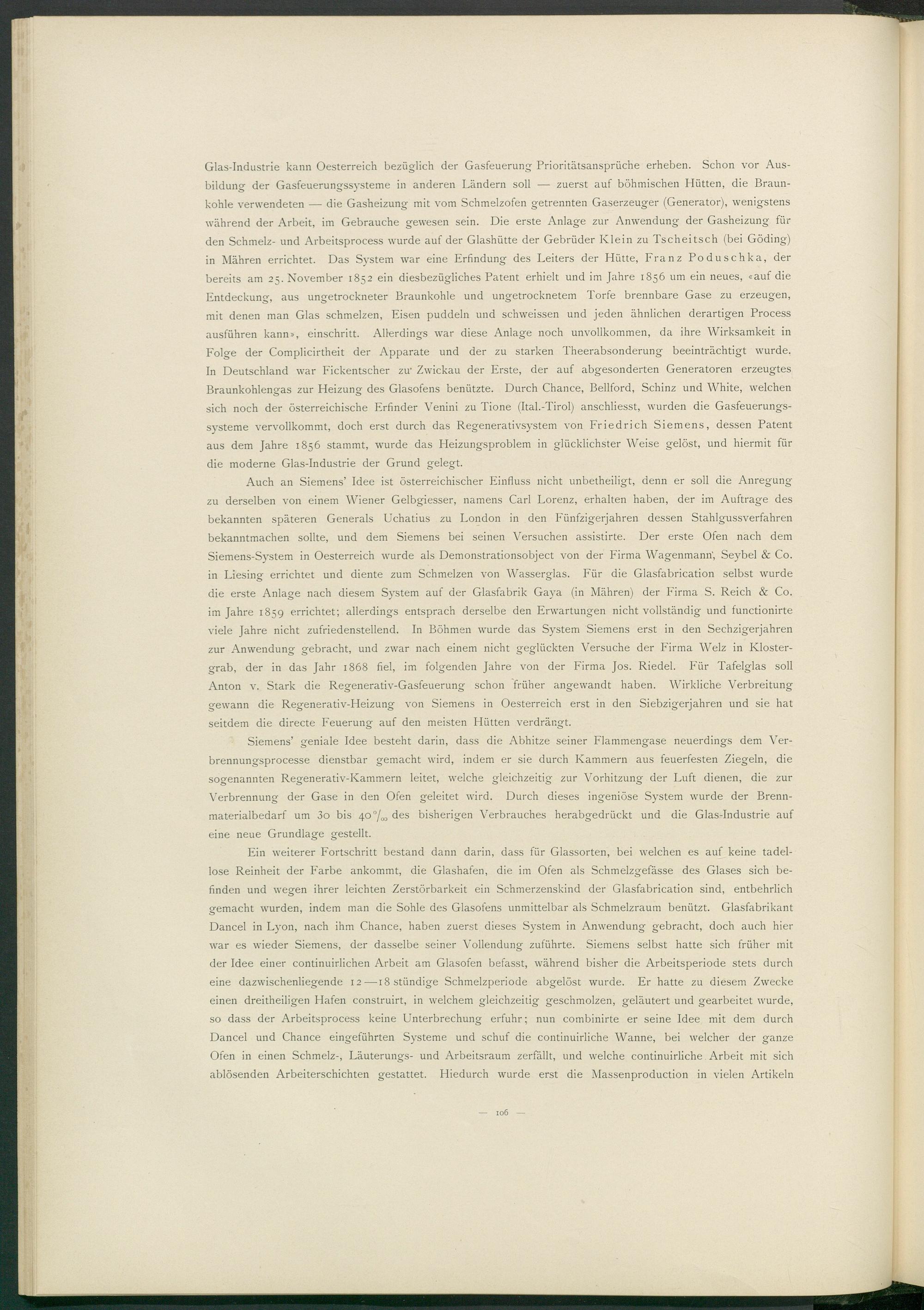 Glas-Industrie kann Oesterreich bezüglich der Gasfeuerung Prioritätsansprüche erheben. Schon vor Ausbildung der Gasfeuerungssysteme in anderen Ländern soll — zuerst auf böhmischen Hütten, die Braunkohle verwendeten — die Gasheizung mit vom Schmelzofen getrennten Gaserzeuger (Generator), wenigstens während der Arbeit, im Gebrauche gewesen sein. Die erste Anlage zur Anwendung der Gasheizung für den Schmelz- und Arbeitsprocess wurde auf der Glashütte der Gebrüder Klein zu Tscheitsch (bei Göding) in Mähren errichtet. Das System war eine Erfindung des Leiters der Hütte, Franz Poduschka, der bereits am 25. November 1852 ein diesbezügliches Patent erhielt und im Jahre 1856 um ein neues, «auf die Entdeckung, aus ungetrockneter Braunkohle und ungetrocknetem Torfe brennbare Gase zu erzeugen, mit denen man Glas schmelzen, Eisen puddeln und schweissen und jeden ähnlichen derartigen Process ausführen kann», einschritt. Allerdings war diese Anlage noch unvollkommen, da ihre Wirksamkeit in Folge der Complicirtheit der Apparate und der zu starken Theerabsonderung beeinträchtigt wurde. In Deutschland war Fickentscher zu 1 Zwickau der Erste, der auf abgesonderten Generatoren erzeugtes Braunkohlengas zur Heizung des Glasofens benützte. Durch Chance, Bellford, Schinz und White, welchen sich noch der österreichische Erfinder Venini zu Tione (Ital.-Tirol) anschliesst, wurden die Gasfeuerungssysteme vervollkommt, doch erst durch das Regenerativsystem von Friedrich Siemens, dessen Patent aus dem Jahre 1856 stammt, wurde das Heizungsproblem in glücklichster Weise gelöst, und hiermit für die moderne Glas-Industrie der Grund gelegt.