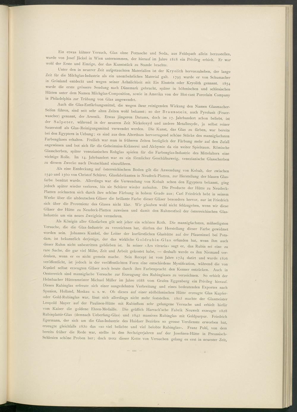 Als Königin aller Glasfarben gilt seit jeher ein schönes Roth. Die mannigfachsten, mühseligsten Versuche, die die Glas-Industrie zu verzeichnen hat, dürften der Herstellung dieser Farbe gewidmet worden sein. Johannes Kunkel, der Leiter der kurfürstlichen Glashütte auf der Pfaueninsel bei Potsdam, ist bekanntlich derjenige, der das wirkliche Goldrubin-Glas erfunden hat, wenn ihm auch dieser Ruhm nicht unbestritten geblieben ist. In seiner «Ars vitraria» sagt er, das Rubin sei eine zu rare Sache, die gar viel Mühe, Zeit und Arbeit gekostet habe, — deshalb werde es ihm Niemand verdenken, wenn er es nicht gemein mache. Sein Recept ist vom Jahre 1734 datirt und wurde 1826 veröffentlicht, ist jedoch in der veröffentlichten Form eine entschiedene Mystification, während die von Kunkel selbst erzeugten Gläser noch heute durch ihre Farbenpracht den Kenner entzücken. Auch in Oesterreich sind mannigfache Versuche zur Erzeugung des Rubinglases zu verzeichnen. So erhielt der Helmbacher Hüttenmeister Michael Müller im Jahre 1688 vom Grafen Eggenberg ein Privileg hierauf. Dieses Rubinglas erfreute sich einer ausgedehnten Verbreitung und eines bedeutenden Exportes nach Spanien, Holland, Moskau u. s. w. Ob dieses auf einer südböhmischen Hütte erzeugte Glas Kupferoder Gold-Rubinglas war, lässt sich allerdings nicht mehr feststellen. i 8 o 3 machte der Glasmeister Leopold Mayer auf der Paulinen-Hiitte mit Rubinfluss sehr gelungene Versuche und erhielt hiefür vom Kaiser die goldene Ehren-Medaille. Die gräflich Harrach’sche Fabrik Neuwelt erzeugte 1828 Rubinplattir-Glas (demnach Ueberfang-Glas) und 1842 massives Rubinglas mit Goldpurpur. Friedrich Egermann, der sich um die Glas-Industrie des Haidaer Bezirkes so grosse Verdienste erworben hat, erzeugte gleichfalls 1800 das «so viel beliebte und viel belobte Rubinglas». Franz Pohl, von dem bereits früher die Rede war, stellte in den Sechzigerjahren auf der Josefinen-Hütte in Preussisch- Schlesien schöne Proben her; doch trotz dieser Kette von Versuchen gelang es erst in neuester Zeit,