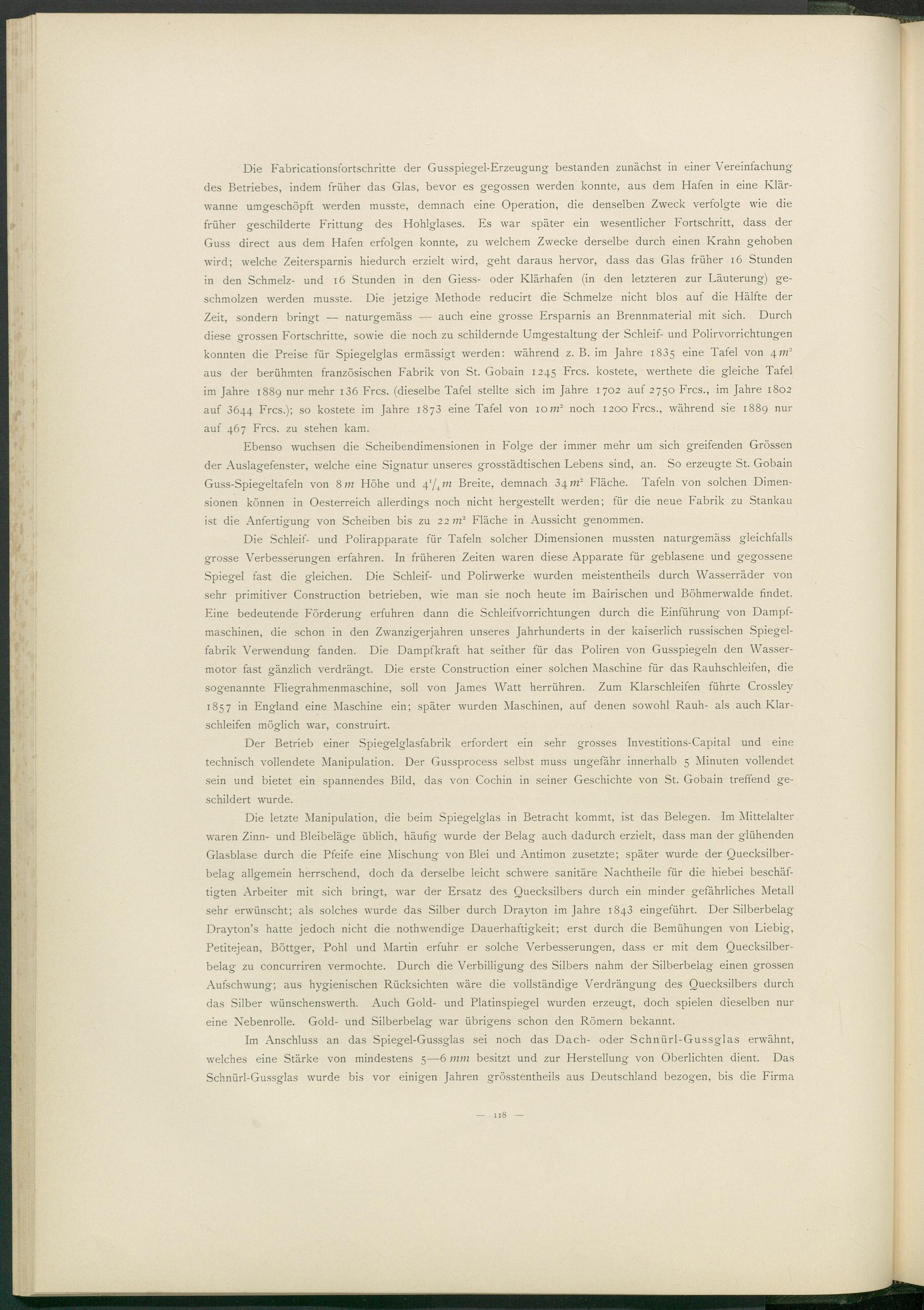 Die Fabricationsfortschritte der Gusspiegel-Erzeugung bestanden zunächst in einer Vereinfachung des Betriebes, indem früher das Glas, bevor es gegossen werden konnte, aus dem Hafen in eine Klärwanne umgeschöpft werden musste, demnach eine Operation, die denselben Zweck verfolgte wie die früher geschilderte Frittung des Hohlglases. Es war später ein wesentlicher Fortschritt, dass der Guss direct aus dem Hafen erfolgen konnte, zu welchem Zwecke derselbe durch einen Krahn gehoben wird; welche Zeitersparnis hiedurch erzielt wird, geht daraus hervor, dass das Glas früher 16 Stunden in den Schmelz- und 16 Stunden in den Giess- oder Klärhafen (in den letzteren zur Läuterung) geschmolzen werden musste. Die jetzige Methode reducirt die Schmelze nicht blos auf die Hälfte der Zeit, sondern bringt — naturgemäss — auch eine grosse Ersparnis an Brennmaterial mit sich. Durch diese grossen Fortschritte, sowie die noch zu schildernde Umgestaltung der Schleif- und Polirvorrichtungen konnten die Preise für Spiegelglas ermässigt werden: während z. B. im Jahre 1805 eine Tafel von 4m 2 aus der berühmten französischen Fabrik von St. Gobain 1245 Frcs. kostete, werthete die gleiche Tafel im Jahre 1889 nur mehr i 36 Frcs. (dieselbe Tafel stellte sich im Jahre 1702 auf 2750 Frcs., im Jahre 1802 auf 3644 Frcs.); so kostete im Jahre 1873 eine Tafel von 1 om 2 noch 1200 Frcs., während sie 1889 nur auf 467 Frcs. zu stehen kam.