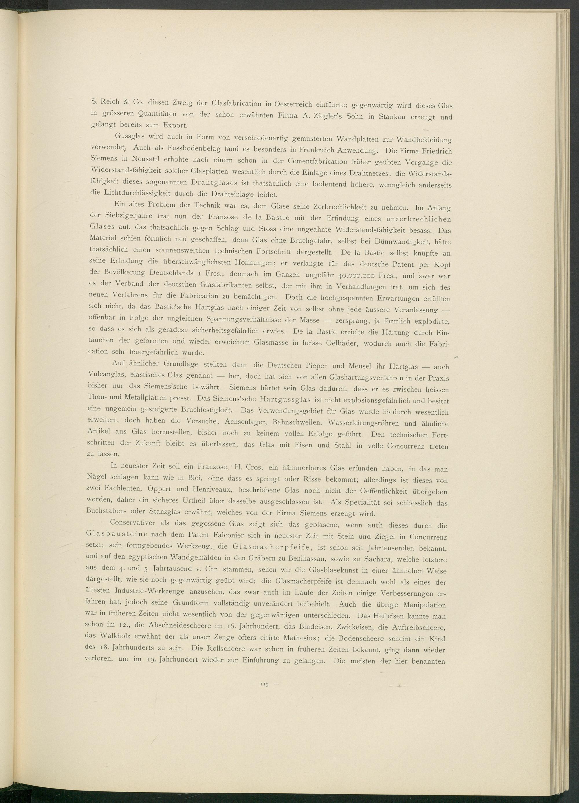 Ein altes Problem der Technik war es, dem Glase seine Zerbrechlichkeit zu nehmen. Im Anfang der Siebzigerjahre trat nun der Franzose de la Bastie mit der Erfindung eines unzerbrechlichen Glases auf, das thatsächlich gegen Schlag und Stoss eine ungeahnte Widerstandsfähigkeit besass. Das Material schien förmlich neu geschaffen, denn Glas ohne Bruchgefahr, selbst bei Dünnwandigkeit, hätte thatsächlich einen staunenswerthen technischen Fortschritt dargestellt. De la Bastie selbst knüpfte an seine Erfindung die überschwänglichsten Hoffnungen; er verlangte für das deutsche Patent per Kopf der Bevölkerung Deutschlands i Frcs., demnach im Ganzen ungefähr 40,000.000 Frcs., und zwar war es der Verband der deutschen Glasfabrikanten selbst, der mit ihm in Verhandlungen trat, um sich des neuen Verfahrens für die Fabrication zu bemächtigen. Doch die hochgespannten Erwartungen erfüllten sich nicht, da das Bastie’sche Hartglas nach einiger Zeit von selbst ohne jede äussere Veranlassung — offenbar in Folge der ungleichen Spannungsverhältnisse der Masse — zersprang, ja förmlich explodirte, so dass es sich als geradezu sicherheitsgefährlich erwies. De la Bastie erzielte die Härtung durch Eintauchen der geformten und wieder erweichten Glasmasse in heisse Oelbäder, wodurch auch die Fabrication sehr feuergefährlich wurde.