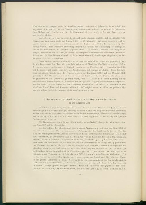 Nachdem die Entwicklung der Decorirung des Glases bis in die Mitte unseres Jahrhunderts von sachkundiger Feder (Herrn Custos Dr. Pazaurek) in diesem Werke eine eingehende specielle Behandlung erfährt, sind nur die Fortschritte auf diesem Gebiete in dem nachfolgenden Zeiträume zu berücksichtigen und ist ein kurzer Rückblick auf die Entwicklung der Raffinirungstechnik bei Behandlung der einzelnen Verfahrensarten zu werfen.