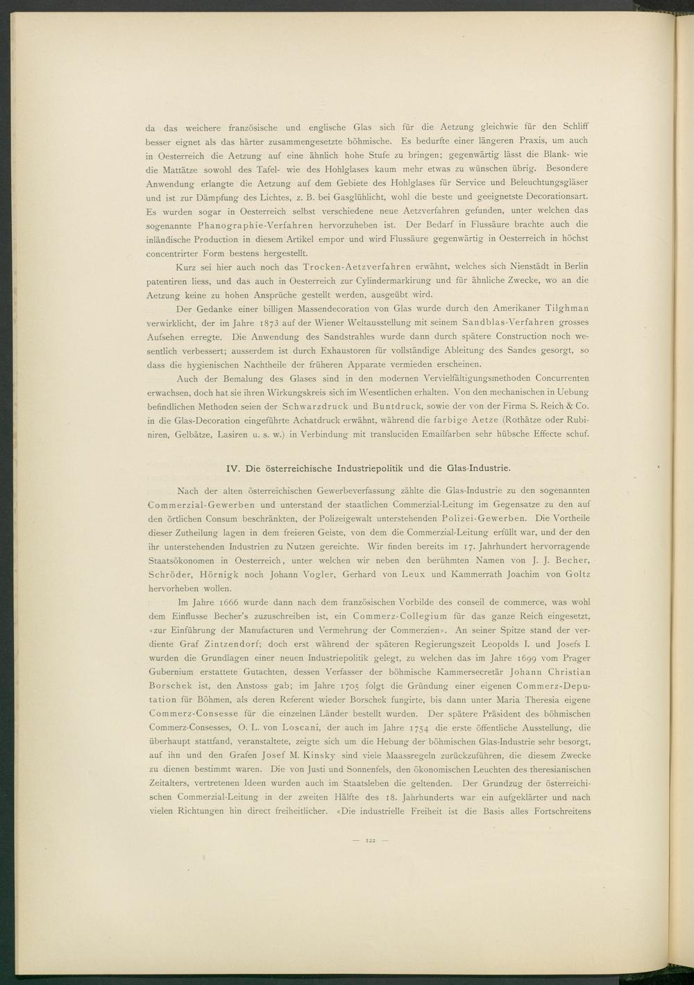 da das weichere französische und englische Glas sich für die Aetzung gleichwie für den Schliff besser eignet als das härter zusammengesetzte böhmische. Es bedurfte einer längeren Praxis, um auch in Oesterreich die Aetzung auf eine ähnlich hohe Stufe zu bringen; gegenwärtig lässt die Blank- wie die Mattätze sowohl des Tafel- wie des Hohlglases kaum mehr etwas zu wünschen übrig. Besondere Anwendung erlangte die Aetzung auf dem Gebiete des Hohlglases für Service und Beleuchtungsgläser und ist zur Dämpfung des Lichtes, z. B. bei Gasglühlicht, wohl die beste und geeignetste Decorationsart. Es wurden sogar in Oesterreich selbst verschiedene neue Aetzverfahren gefunden, unter welchen das sogenannte Phanographie-Verfahren hervorzuheben ist. Der Bedarf in Flussäure brachte auch die inländische Production in diesem Artikel empor und wird Flussäure gegenwärtig in Oesterreich in höchst concentrirter Form bestens hergestellt.