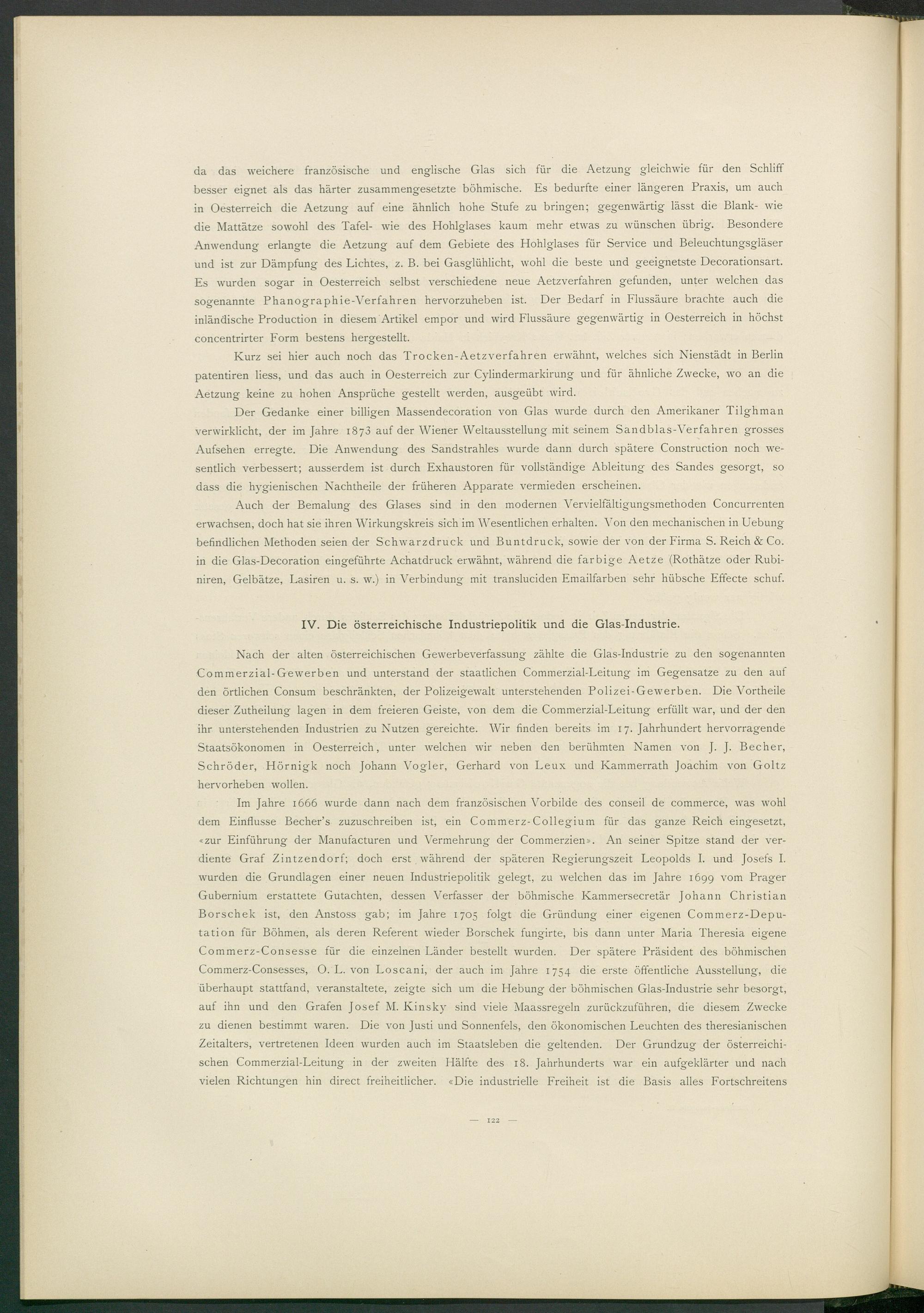 Im Jahre 1666 wurde dann nach dem französischen Vorbilde des conseil de commerce, was wohl dem Einflüsse Bechers zuzuschreiben ist, ein Commerz-Collegium für das ganze Reich eingesetzt, «zur Einführung der Manufacturen und Vermehrung der Commerzien». An seiner Spitze stand der ver­diente Graf Zintzendorf; doch erst während der späteren Regierungszeit Leopolds I. und Josefs I. wurden die Grundlagen einer neuen Industriepolitik gelegt, zu welchen das im Jahre 1699 vom Prager Gubernium erstattete Gutachten, dessen Verfasser der böhmische Kammersecretär Johann Christian Borschek ist, den Anstoss gab; im Jahre 1705 folgt die Gründung einer eigenen Commerz-Depu­tation für Böhmen, als deren Referent wieder Borschek fungirte, bis dann unter Maria Theresia eigene Commerz-Consesse für die einzelnen Länder bestellt wurden. Der spätere Präsident des böhmischen Commerz-Consesses, O. L. von Loscani, der auch im Jahre 1754 die erste öffentliche Ausstellung, die überhaupt stattfand, veranstaltete, zeigte sich um die Hebung der böhmischen Glas-Industrie sehr besorgt, auf ihn und den Grafen Josef M. Ivinsky sind viele Maassregeln zurückzuführen, die diesem Zwecke zu dienen bestimmt waren. Die von Justi und Sonnenfels, den ökonomischen Leuchten des theresianischen Zeitalters, vertretenen Ideen wurden auch im Staatsleben die geltenden. Der Grundzug der österreichi- sehen Commerzial-Leitung in der zweiten Hälfte des 18. Jahrhunderts war ein aufgeklärter und nach vielen Richtungen hin direct freiheitlicher. «Die industrielle Freiheit ist die Basis alles Fortschreitens