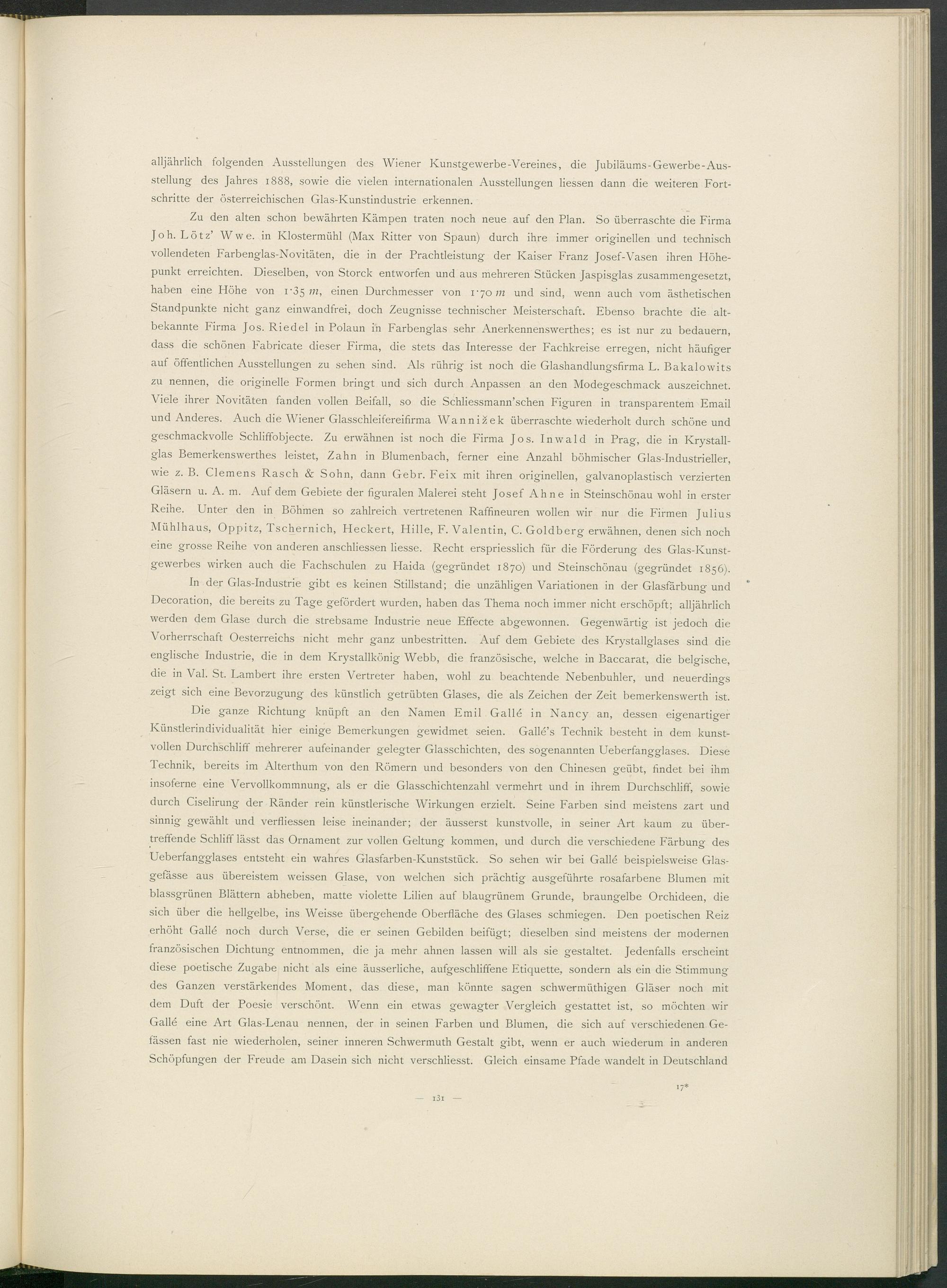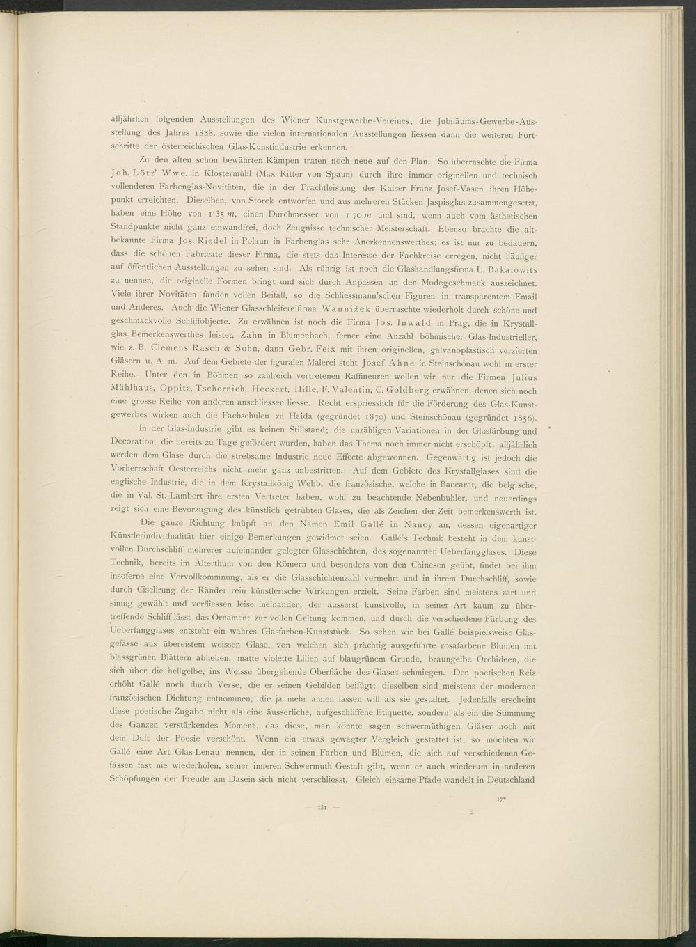 alljährlich folgenden Ausstellungen des Wiener Kunstgewerbe-Vereines, die Jubiläums-Gewerbe-Ausstellung des Jahres 1888, sowie die vielen internationalen Ausstellungen Hessen dann die weiteren Fortschritte der österreichischen Glas-Kunstindustrie erkennen.
