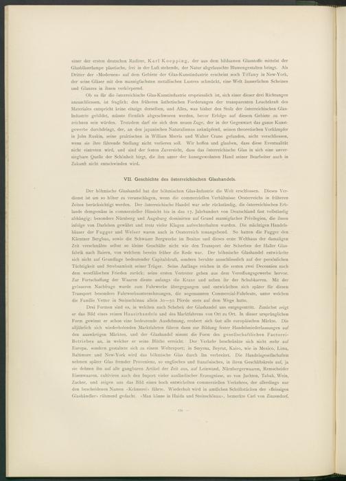 Ob es für die österreichische Glas-Kunstindustrie erspriesslich ist, sich einer dieser drei Richtungen anzuschliessen, ist fraglich; den früheren ästhetischen Forderungen der transparenten Leuchtkraft des Materiales entspricht keine einzige derselben, und Alles, was bisher den Stolz der österreichischen Glasindustrie gebildet, müsste förmlich abgeschworen werden, bevor Erfolge auf diesem Gebiete zu verzeichnen sein würden. Trotzdem darf sie sich dem neuen Zuge, der in der Gegenwart das ganze Kunstgewerbe durchdringt, der, an den japanischen Naturalismus anknüpfend, seinen theoretischen Vorkämpfer in John Ruskin, seine praktischen in William Morris und Walter Crane gefunden, nicht verschliessen, wenn sie ihre führende Stellung nicht verlieren soll. Wir hoffen und glauben, dass diese Eventualität nicht eintreten wird, und sind der festen Zuversicht, dass das österreichische Glas in sich eine unversiegbare Quelle der Schönheit birgt, die ihm unter der kunstgewohnten Hand seiner Bearbeiter auch in Zukunft nicht entschwinden wird.