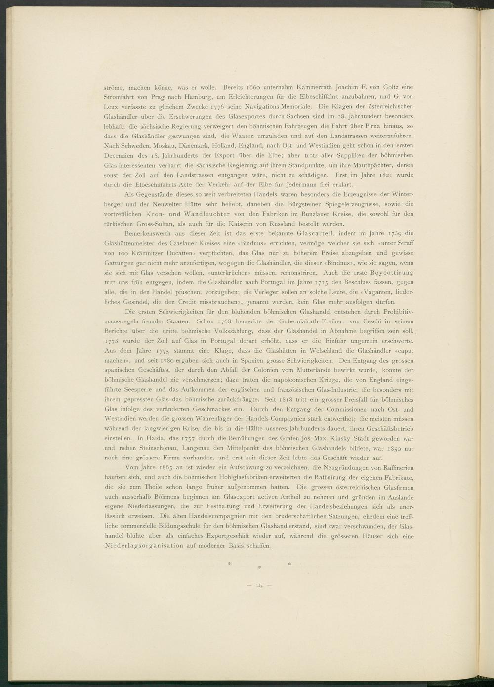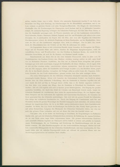 Die ersten Schwierigkeiten für den blühenden böhmischen Glashandel entstehen durch Prohibitiv- maassregeln fremder Staaten. Schon 1768 bemerkte der Gubernialrath Freiherr von Ceschi in seinem Berichte über die dritte böhmische Volkszählung, dass der Glashandel in Abnahme begriffen sein soll. 1773 wurde der Zoll auf Glas in Portugal derart erhöht, dass er die Einfuhr ungemein erschwerte. Aus dem Jahre 1775 stammt eine Klage, dass die Glashütten in Welschland die Glashändler «caput machen», und seit 1780 ergaben sich auch in Spanien grosse Schwierigkeiten. Den Entgang des grossen spanischen Geschäftes, der durch den Abfall der Colonien vom Mutterlande bewirkt wurde, konnte der böhmische Glashandel nie verschmerzen; dazu traten die napoleonischen Kriege, die von England eingeführte Seesperre und das Aufkommen der englischen und französischen Glas-Industrie, die besonders mit ihrem gepressten Glas das böhmische zurückdrängte. Seit 1818 tritt ein grosser Preisfall für böhmisches Glas infolge des veränderten Geschmackes ein. Durch den Entgang der Commissionen nach Ost- und Westindien werden die grossen Waarenlager der Handels-Compagnien stark entwerthet; die meisten müssen während der langwierigen Krise, die bis in die Hälfte unseres Jahrhunderts dauert, ihren Geschäftsbetrieb einstellen. In Haida, das 1757 durch die Bemühungen des Grafen Jos. Max. Kinsky Stadt geworden war und neben Steinschönau, Langenau den Mittelpunkt des böhmischen Glashandels bildete, war 1850 nur noch eine grössere Firma vorhanden, und erst seit dieser Zeit lebte das Geschäft wieder auf.