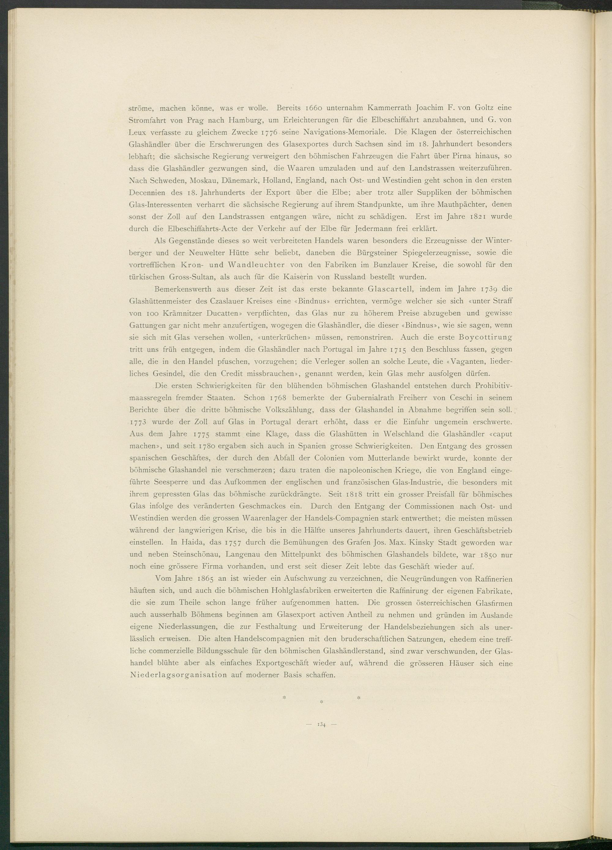 ströme, machen könne, was er wolle. Bereits 1660 unternahm Kammerrath Joachim F. von Goltz eine Stromfahrt von Prag nach Hamburg, um Erleichterungen für die Elbeschiffahrt anzubahnen, und G. von Leux verfasste zu gleichem Zwecke 1776 seine Navigations-Memoriale. Die Klagen der österreichischen Glashändler über die Erschwerungen des Glasexportes durch Sachsen sind im 18. Jahrhundert besonders lebhaft; die sächsische Regierung verweigert den böhmischen Fahrzeugen die Fahrt über Pirna hinaus, so dass die Glashändler gezwungen sind, die Waaren umzuladen und auf den Landstrassen weiterzuführen. Nach Schweden, Moskau, Dänemark, Holland, England, nach Ost- und Westindien geht schon in den ersten Decennien des 18. Jahrhunderts der Export über die Elbe; aber trotz aller Suppliken der böhmischen Glas-Interessenten verharrt die sächsische Regierung auf ihrem Standpunkte, um ihre Mauthpächter, denen sonst der Zoll auf den Landstrassen entgangen wäre, nicht zu schädigen. Erst im Jahre 1821 wurde durch die Elbeschiffahrts-Acte der Verkehr auf der Elbe für Jedermann frei erklärt.