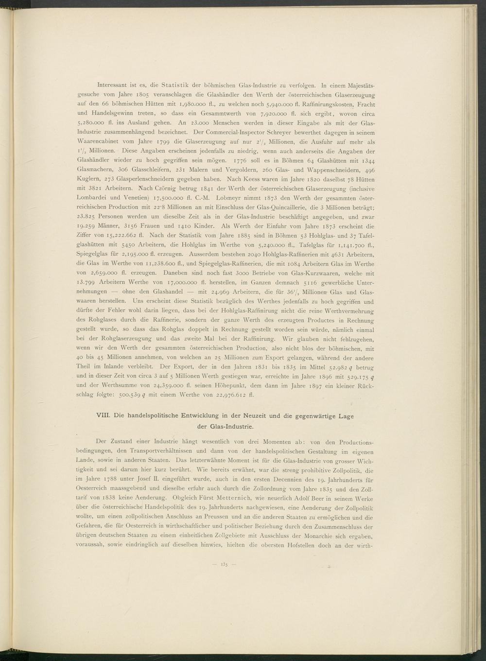 Der Zustand einer Industrie hängt wesentlich von drei Momenten ab: von den Productions- bedingungen, den Transportverhältnissen und dann von der handelspolitischen Gestaltung im eigenen Lande, sowie in anderen Staaten. Das letzterwähnte Moment ist für die Glas-Industrie von grosser Wichtigkeit und sei darum hier kurz berührt. Wie bereits erwähnt, war die streng prohibitive Zollpolitik, die im Jahre 1788 unter Josef II. eingeführt wurde, auch in den ersten Decennien des 19. Jahrhunderts für Oesterreich maassgebend und dieselbe erfuhr auch durch die Zollordnung vom Jahre 1835 und den Zolltarif von i 838 keine Aenderung. Obgleich Fürst Metternich, wie neuerlich Adolf Beer in seinem Werke über die österreichische Handelspolitik des 19. Jahrhunderts nachgewiesen, eine Aenderung der Zollpolitik wollte, um einen zollpolitischen Anschluss an Preussen und an die anderen Staaten zu ermöglichen und die Gefahren, die für Oesterreich in wirthschaftlicher und politischer Beziehung durch den Zusammenschluss der übrigen deutschen Staaten zu einem einheitlichen Zollgebiete mit Ausschluss der Monarchie sich ergaben, voraussah, sowie eindringlich auf dieselben hinwies, hielten die obersten Hofstellen doch an der wirth-