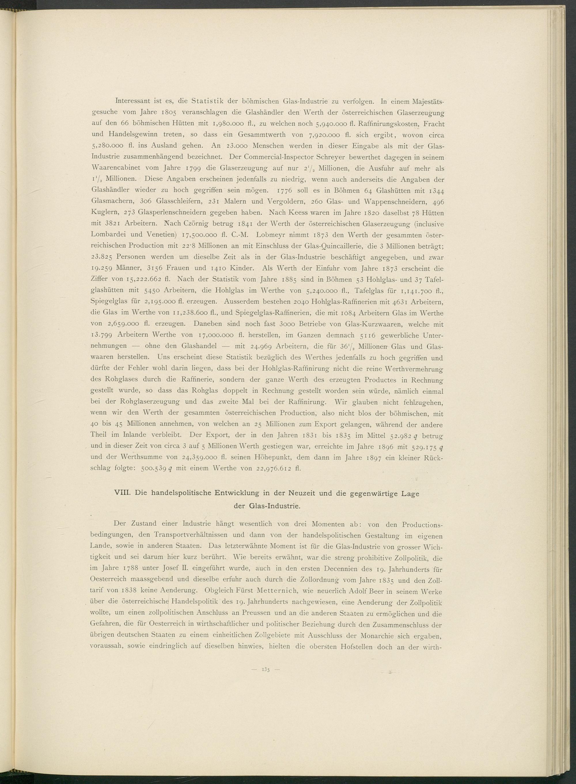 Interessant ist es, die Statistik der böhmischen Glas-Industrie zu verfolgen. In einem Majestätsgesuche vom Jahre 1805 veranschlagen die Glashändler den Werth der österreichischen Glaserzeugung auf den 66 böhmischen Hütten mit 1,980.000 fl., zu welchen noch 5,940.000 fl. Raffinirungskosten, Fracht und Handelsgewinn treten, so dass ein Gesammtwerth von 7,920.000 fl. sich ergibt, wovon circa 5,280.000 fl. ins Ausland gehen. An 23.000 Menschen werden in dieser Eingabe als mit der Glasindustrie zusammenhängend bezeichnet. Der Commercial-Inspector Schreyer bewerthet dagegen in seinem Waarencabinet vom Jahre 1799 die Glaserzeugung auf nur 2'/, Millionen, die Ausfuhr auf mehr als 1 ‘/ 3 Millionen. Diese Angaben erscheinen jedenfalls zu niedrig, wenn auch anderseits die Angaben der Glashändler wieder zu hoch gegriffen sein mögen. 1776 soll es in Böhmen 64 Glashütten mit 1344 Glasmachern, 3 o 6 Glasschleifern, 23 1 Malern und Vergoldern, 260 Glas- und Wappenschneidern, 496 Kuglern, 273 Glasperlenschneidern gegeben haben. Nach Keess waren im Jahre 1820 daselbst 78 Hütten mit 3821 Arbeitern. Nach Czörnig betrug 1841 der Werth der österreichischen Glaserzeugung (inclusive Lombardei und Venetien) 17,500.000 fl. C.-M. Lobmeyr nimmt 1873 den Werth der gesammten österreichischen Production mit 22' 8 Millionen an mit Einschluss der Glas-Quincaillerie, die 3 Millionen beträgt; 23.825 Personen werden um dieselbe Zeit als in der Glas-Industrie beschäftigt angegeben, und zwar 19.259 Männer, 3156 Frauen und 1410 Kinder. Als Werth der Einfuhr vom Jahre 1873 erscheint die Ziffer von 15,222.662 fl. Nach der Statistik vom Jahre 1885 sind in Böhmen 53 Hohlglas- und 3 7 Tafelglashütten mit 5450 Arbeitern, die Hohlglas im Werthe von 5,240.000 fl., Tafelglas für 1,141.700 fl., Spiegelglas für 2,195.000 fl. erzeugen. Ausserdem bestehen 2040 Hohlglas-Raffinerien mit 46dl Arbeitern, die Glas im Werthe von 11,238.600 fl., und Spiegelglas-Raffinerien, die mit 1084 Arbeitern Glas im Werthe von 2,659.000 fl. erzeugen. Daneben sind noch fast 3 ooo Betriebe von Glas-Kurzwaaren, welche mit 13.799 Arbeitern Werthe von 17,000.000 fl. hersteilen, im Ganzen demnach 5116 gewerbliche Unternehmungen — ohne den Glashandel — mit 24.969 Arbeitern, die für 36 '/, Millionen Glas und Glas- waaren hersteilen. Uns erscheint diese Statistik bezüglich des Werthes jedenfalls zu hoch gegriffen und dürfte der Fehler wohl darin liegen, dass bei der Hohlglas-Raffinirung nicht die reine Werth Vermehrung des Rohglases durch die Raffinerie, sondern der ganze Werth des erzeugten Productes in Rechnung gestellt wurde, so dass das Rohglas doppelt in Rechnung gestellt worden sein würde, nämlich einmal bei der Rohglaserzeugung und das zweite Mal bei der Raffinirung. Wir glauben nicht fehlzugehen, wenn wir den Werth der gesammten österreichischen Production, also nicht blos der böhmischen, mit 40 bis 45 Millionen annehmen, von welchen an 25 Millionen zum Export gelangen, während der andere Theil im Inlande verbleibt. Der Export, der in den Jahren 1 83 1 bis 1835 im Mittel 52.982 q betrug und in dieser Zeit von circa 3 auf 5 Millionen Werth gestiegen war, erreichte im Jahre 1896 mit 529.175 q und der Werthsumme von 24,359.000 fl. seinen Höhepunkt, dem dann im Jahre 1897 ein kleiner Rückschlag folgte: 500.539 <7 mit einem Werthe von 22,976.612 fl.