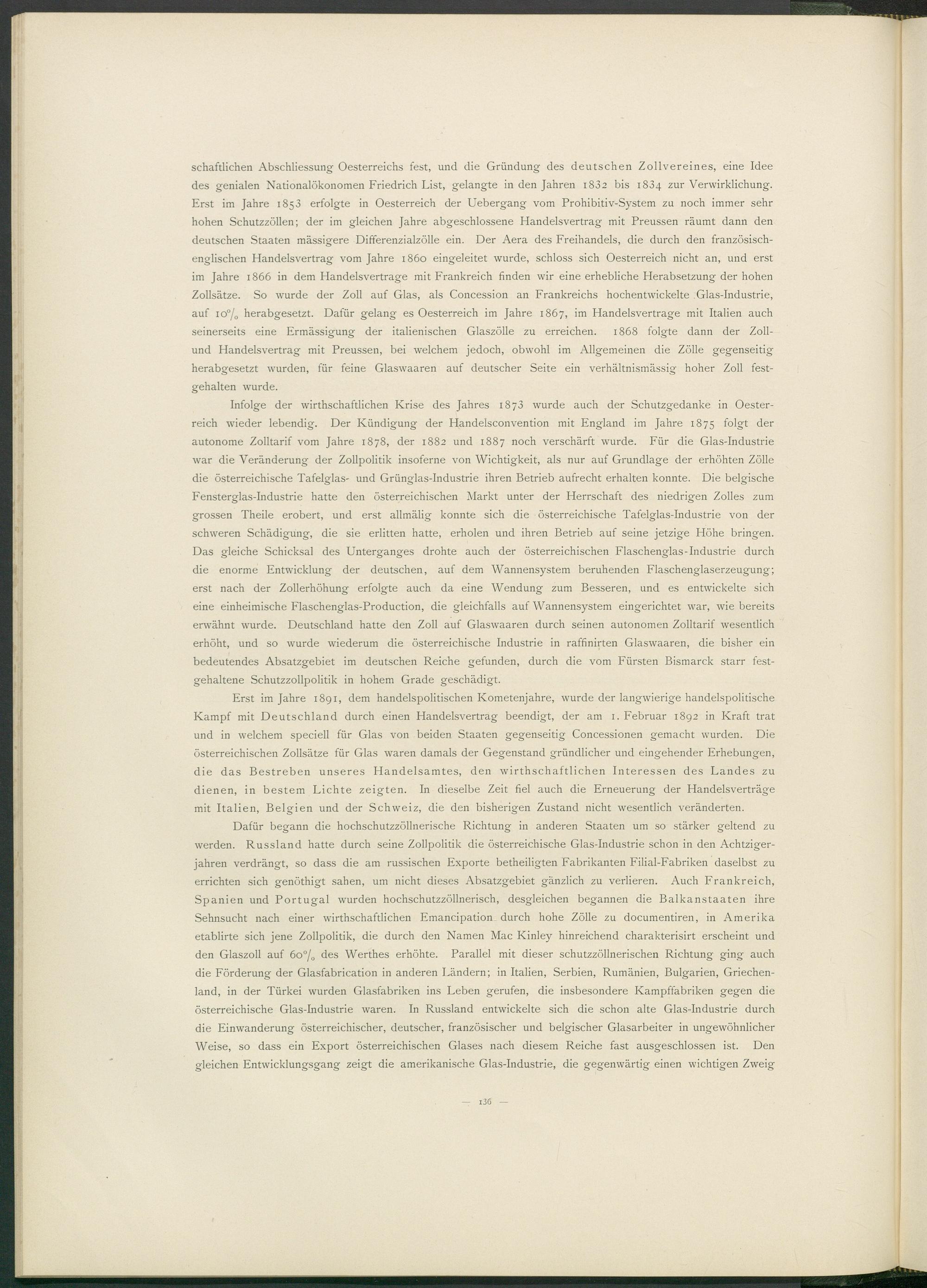 schaftlichen Abschliessung- Oesterreichs fest, und die Gründung des deutschen Zollvereines, eine Idee des genialen Nationalökonomen Friedrich List, gelangte in den Jahren 1832 bis 1834 zur Verwirklichung. Erst im Jahre 1853 erfolgte in Oesterreich der Uebergang vom Prohibitiv-System zu noch immer sehr hohen Schutzzöllen; der im gleichen Jahre abgeschlossene Handelsvertrag mit Preussen räumt dann den deutschen Staaten massigere Differenzialzölle ein. Der Aera des Freihandels, die durch den französischenglischen Handelsvertrag vom Jahre 1860 eingeleitet wurde, schloss sich Oesterreich nicht an, und erst im Jahre 1866 in dem Handelsverträge mit Frankreich finden wir eine erhebliche Herabsetzung der hohen Zollsätze. So wurde der Zoll auf Glas, als Concession an Frankreichs hochentwickelte Glas-Industrie, auf io°/ 0 herabgesetzt. Dafür gelang es Oesterreich im Jahre 1867, im Handelsverträge mit Italien auch seinerseits eine Ermässigung der italienischen Glaszölle zu erreichen. 1868 folgte dann der Zoll- und Handelsvertrag mit Preussen, bei welchem jedoch, obwohl im Allgemeinen die Zölle gegenseitig herabgesetzt wurden, für feine Glaswaaren auf deutscher Seite ein verhältnismässig hoher Zoll festgehalten wurde.