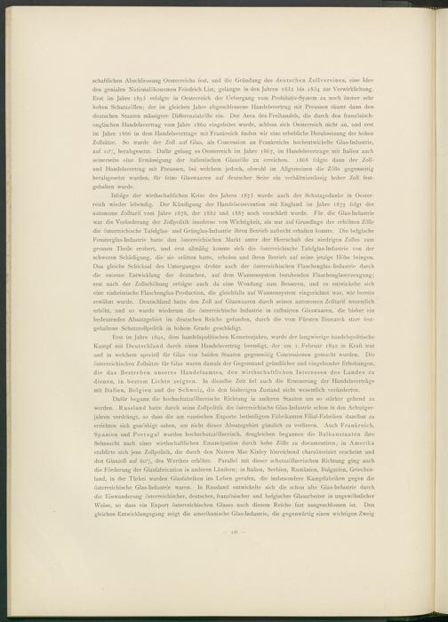 Erst im Jahre 1891, dem handelspolitischen Kometenjahre, wurde der langwierige handelspolitische Kampf mit Deutschland durch einen Handelsvertrag beendigt, der am 1. Februar 1892 in Kraft trat und in welchem speciell für Glas von beiden Staaten gegenseitig Concessionen gemacht wurden. Die österreichischen Zollsätze für Glas waren damals der Gegenstand gründlicher und eingehender Erhebungen, die das Bestreben unseres Handelsamtes, den wirthschaftlichen Interessen des Landes zu dienen, in bestem Lichte zeigten. In dieselbe Zeit fiel auch die Erneuerung der Handelsverträge mit Italien, Belgien und der Schweiz, die den bisherigen Zustand nicht wesentlich veränderten.